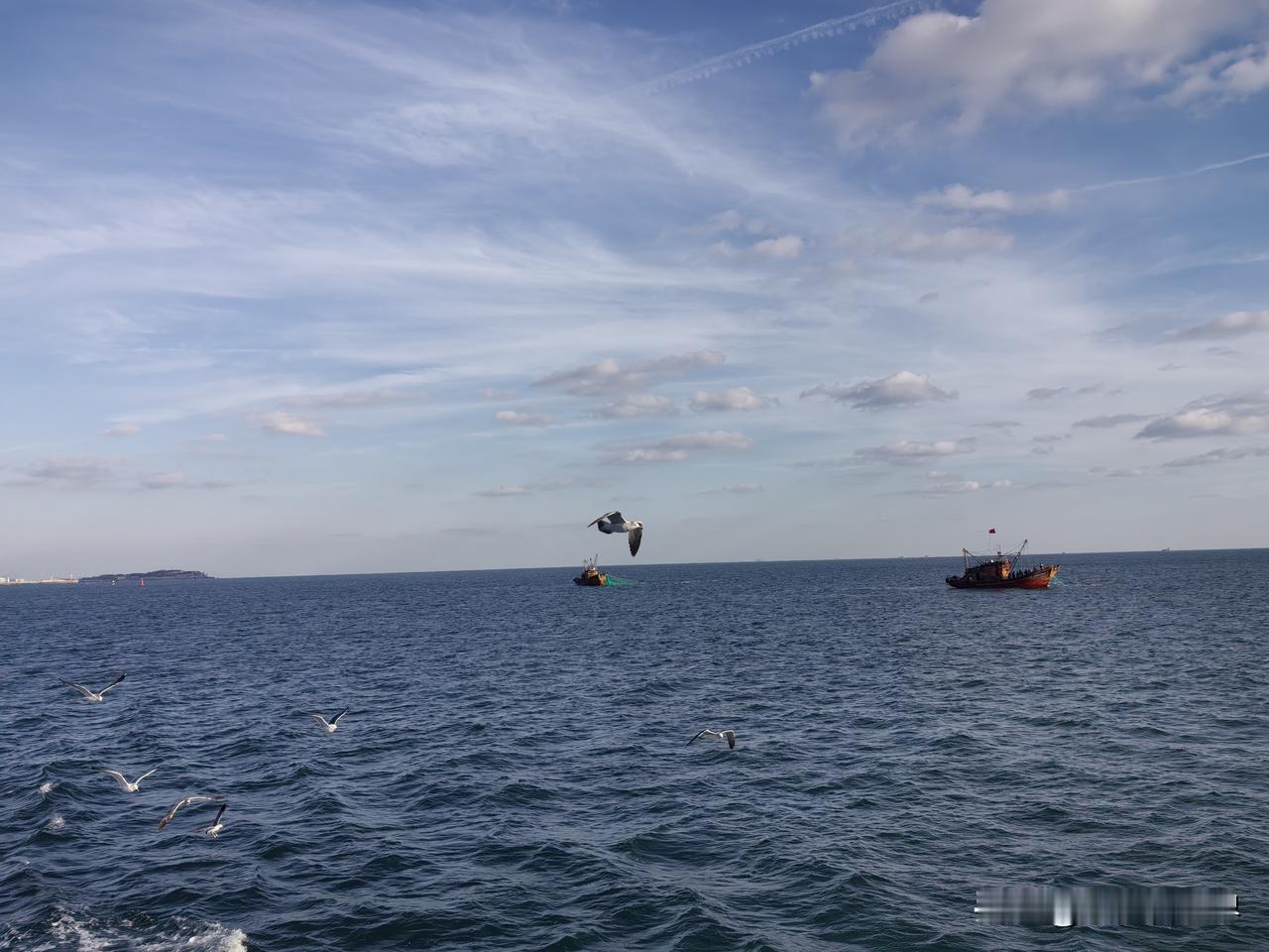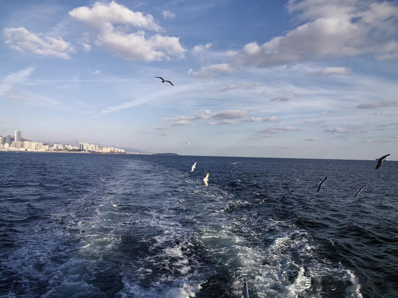 来过青岛好几次了,第一次在奥帆中心这里看到这么美的蓝天白云。 所以决定要去坐游轮看大海,这也是第一次坐游轮看大海,那感觉真是太美妙啦! 与海相拥,看海鸥逐浪翻飞,邂逅一场浪漫之旅。海鸥低飞,吻过浪尖,与风共舞,把孤独唱成了自由的歌。 站在三楼平台上,风有点大,但一路海鸥追逐,俯冲高飞,那种快乐也很快感染我们。 大家举着手机,不断地拍拍拍,而极目远眺,大海一望无际,远处有岛屿大船,近处有游轮和渔船,蓝天碧海,美不胜收。 而且居然这坐游轮,满70周岁还可以免票,但其实我觉得就算花几十元也很值得。 来世间一趟,一定要看看海的辽阔,毕竟自由的风那么甜——冬日青岛行(7)