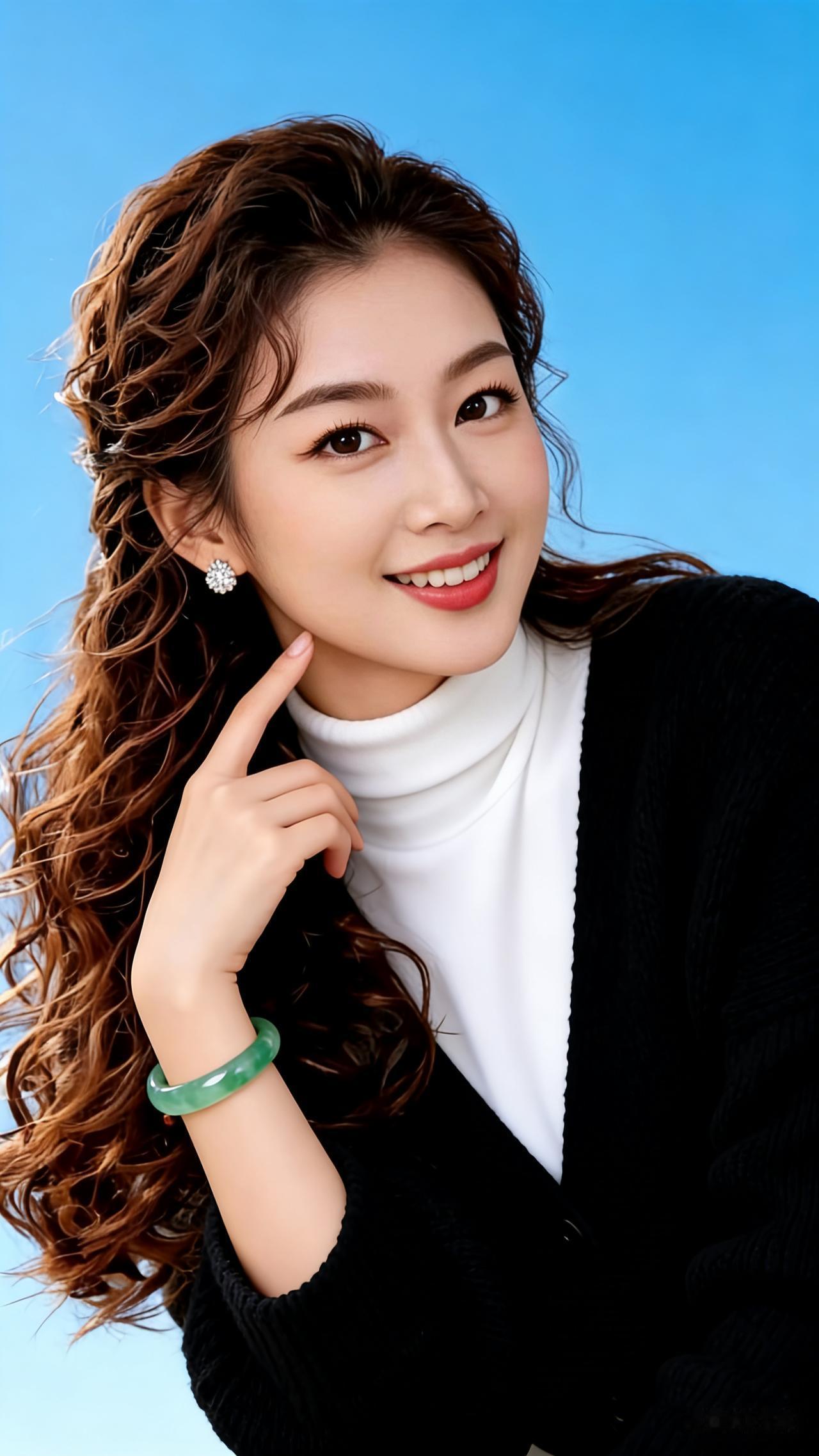 清丽脱俗美人,明眸清澈含情,柳眉弯弯,樱唇娇美,肌肤白皙透亮。着白色毛绒皮草,棕