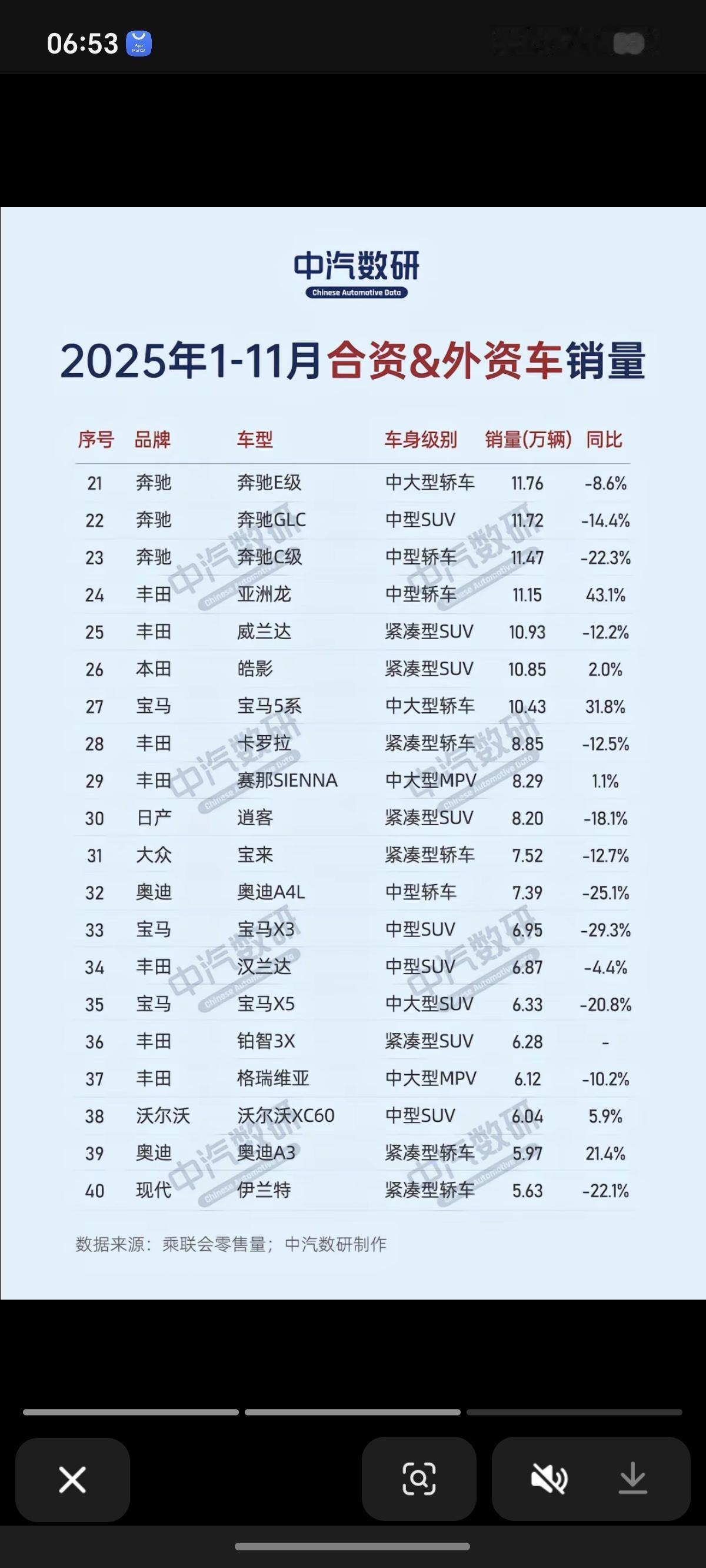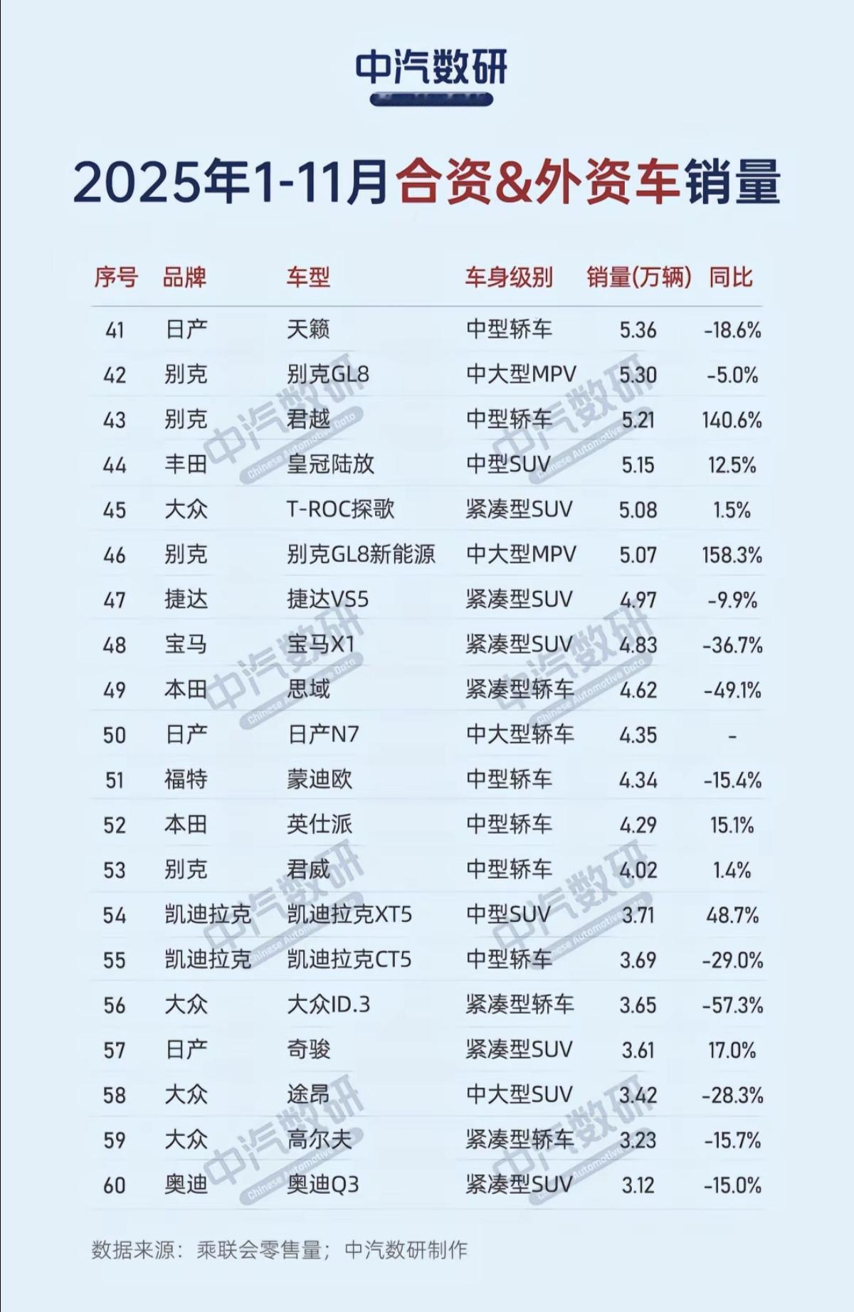 2025年1~11月份合资&外资车销量榜! 特斯拉排名第一,还是可以的!