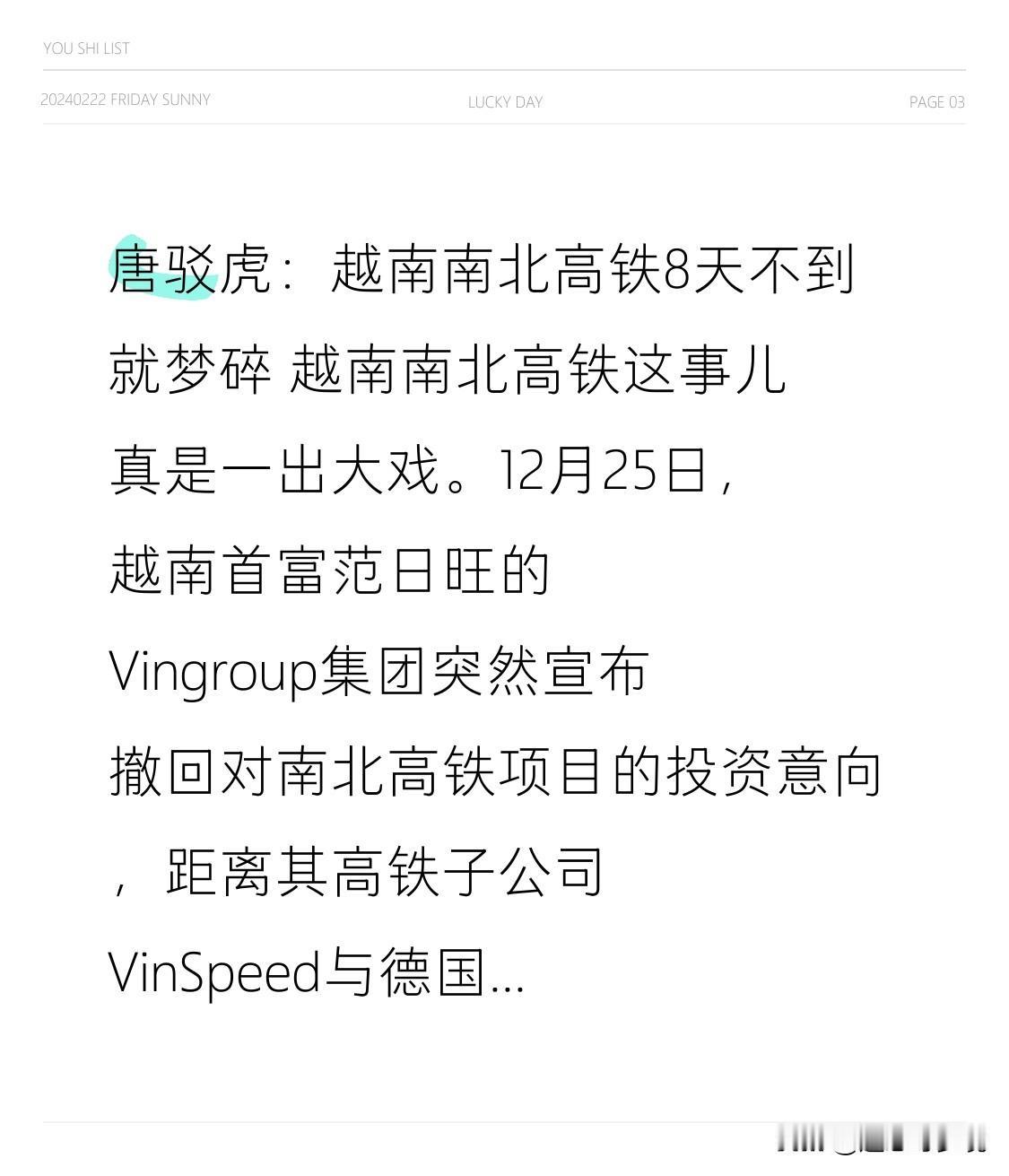 唐驳虎:越南南北高铁8天不到就梦碎 越南南北高铁这事儿真是一出大戏。12月25日,越南首富范日旺的Vingroup集团突然宣布撤回对南北高铁项目的投资意向,距离其高铁子公司VinSpeed与德国西门子签协议才8天。消息一出,Vingroup系股票跌停,范日旺个人财富一天蒸发近20亿美元。 这项目总投资约670亿美元,是越南史上最大基础设施项目。Vingroup集团早在5月就提交提案,撤资主要是因国内质疑其杠杆率高、缺铁路经验。而且越南航空票价低,河内 - 胡志明航线日常票价200 - 300元,廉航还有“0越南盾”促销票,高铁运营难啊,这高铁梦碎得真快。