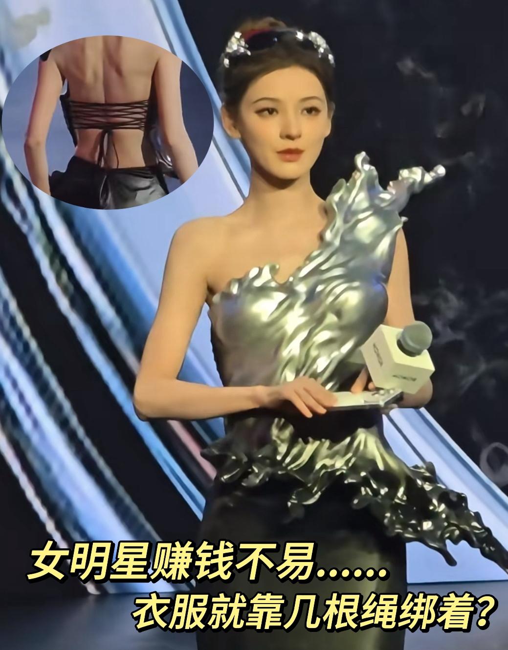 感觉女明星这份职业虽光鲜靓丽,但也不容易呀:瞧,妆容精致的张予曦直接穿着看似硬邦邦的'盔甲'就上台了,其背后只用几根小细绳绷着,这别出心裁的礼服看着都觉得雷人,你认为呢?
