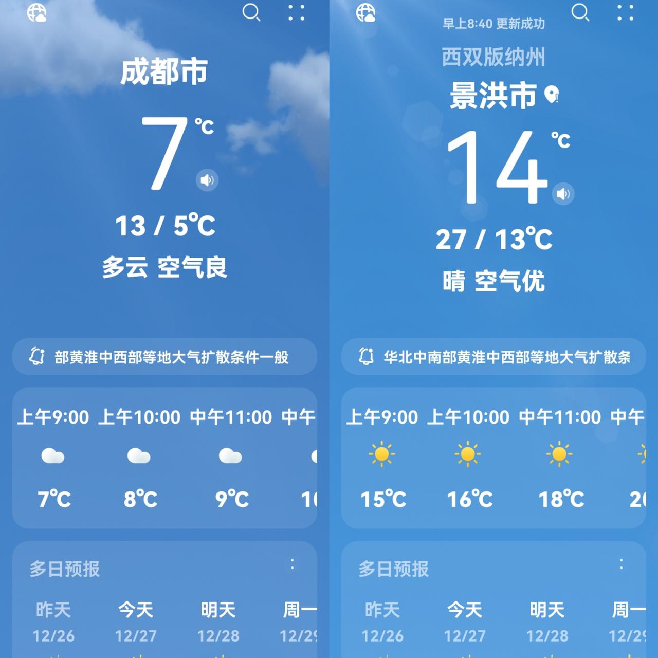 成都与西双版纳的气温对比! 目前,成都市区的最高气温恰好是西双版纳的最低气温。 西双版纳的冬季如同成都地区的秋天:蓝天白云、阳光灿烂、金风送爽。温差明显,昼热夜凉。 到西双版纳避寒近一个月,没见过一滴雨水且天天日光普照。 避寒圣地,果然名副其实!