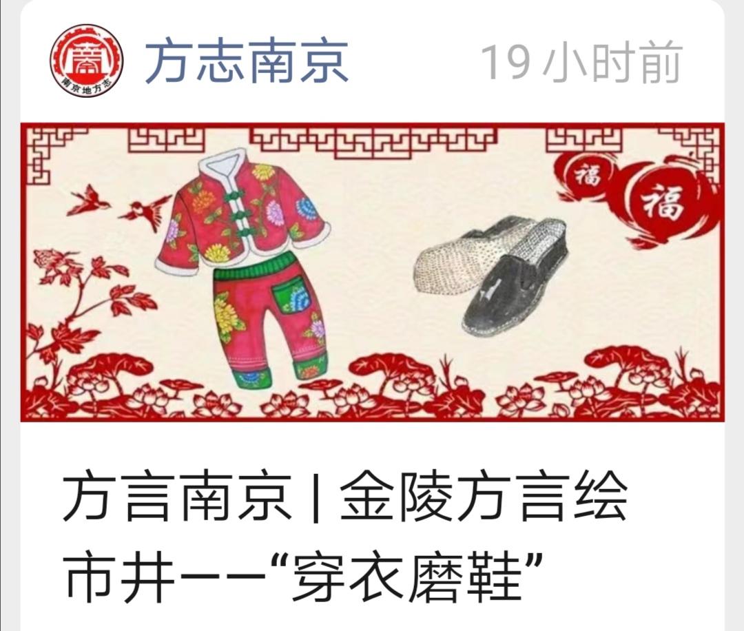 南京老话“穿衣磨鞋” 穿衣磨鞋,背儿思儿,夹敦子、小褂裤、头绳衣、长袍子短套子、单鞋、大马指头,还有龙衣裹袖、拉里拉呱、油腊吐、背刀布、扫裙娘娘等等,这些和衣服相关的老话,您知晓多少呢? 有兴趣的朋友请关注《方志南京》公众号,查看昨日的“方言南京”。