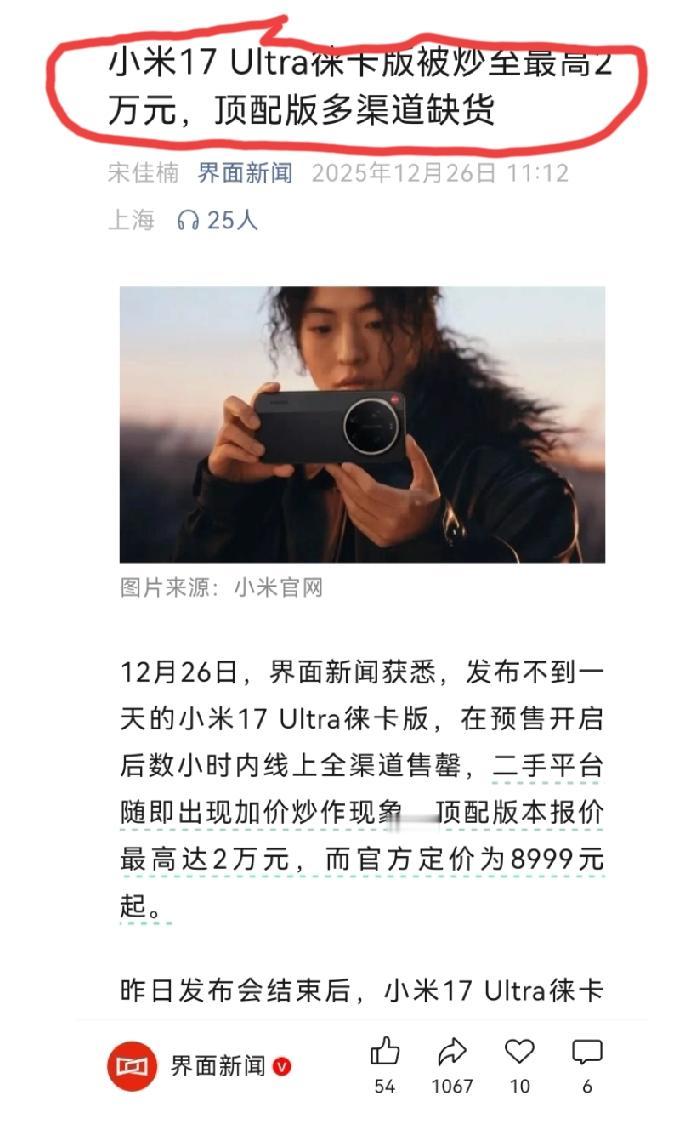 小米17ultra销售形势一片大好:10万台小米17ultra被一抢而空。二手平台上小米17ultra莱卡版更是被炒至最高价2万元。看来小米17ultra 6999的起售价格还是非常友善的,打动了无数消费者追逐高科技产品的那颗蠢蠢欲动的心!特别是加价仅500元的那个莱卡标,就已经给米粉们提供了无数的情绪价值! 有钱人还是多啊,我们搬砖的也就用用2000块的手机可以了!!!