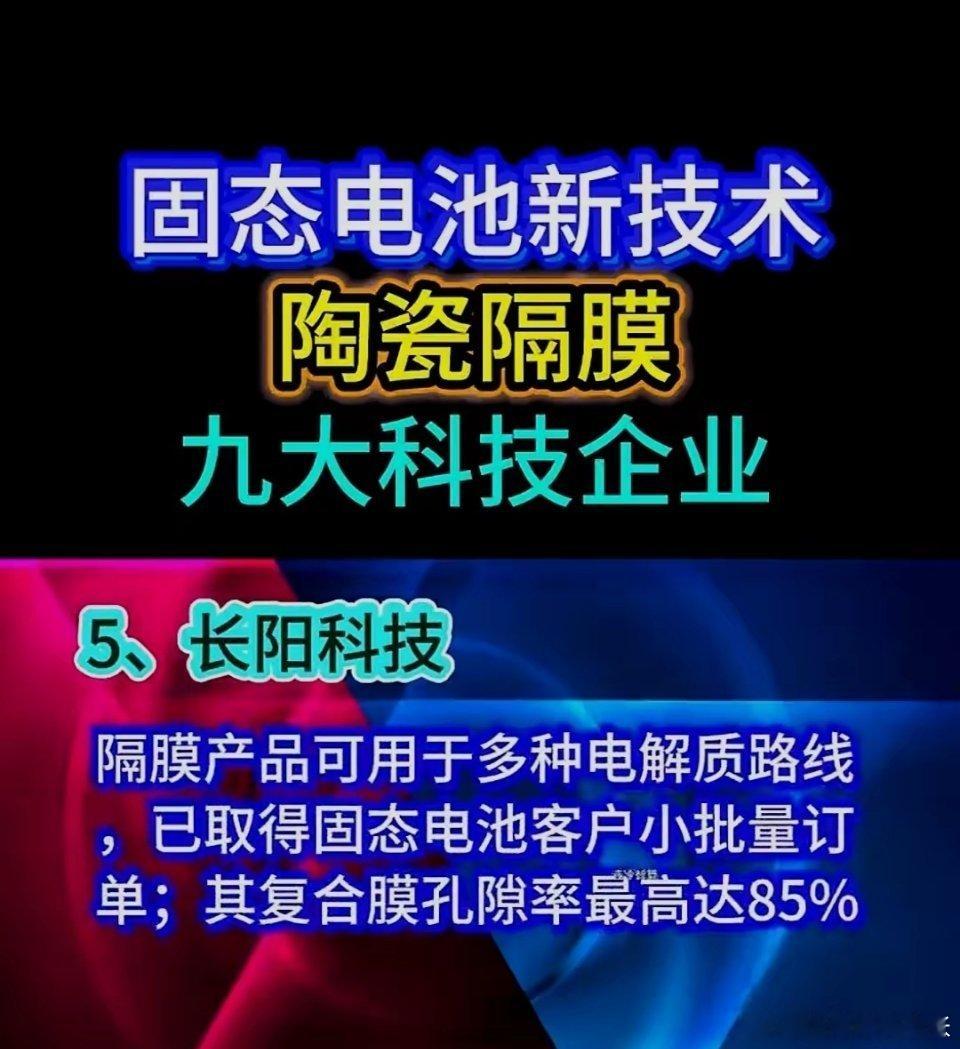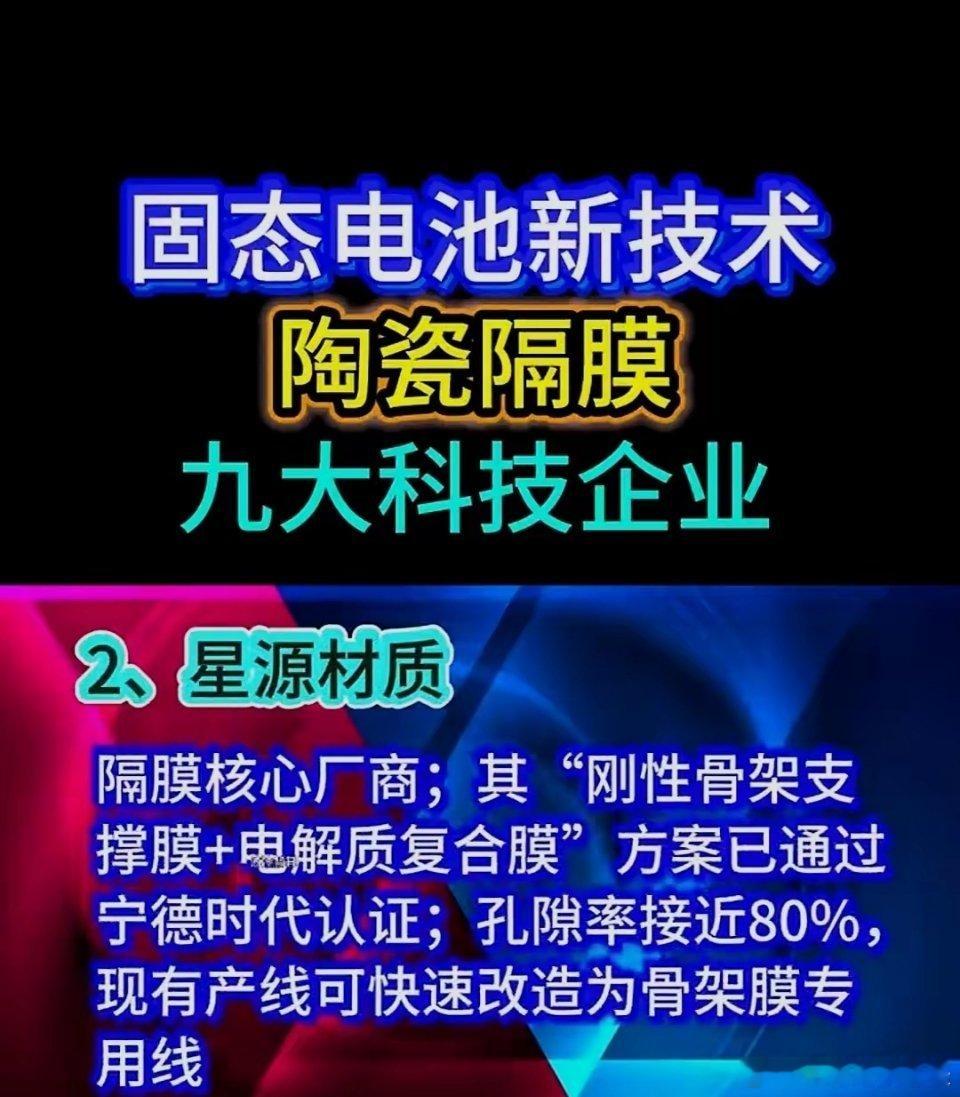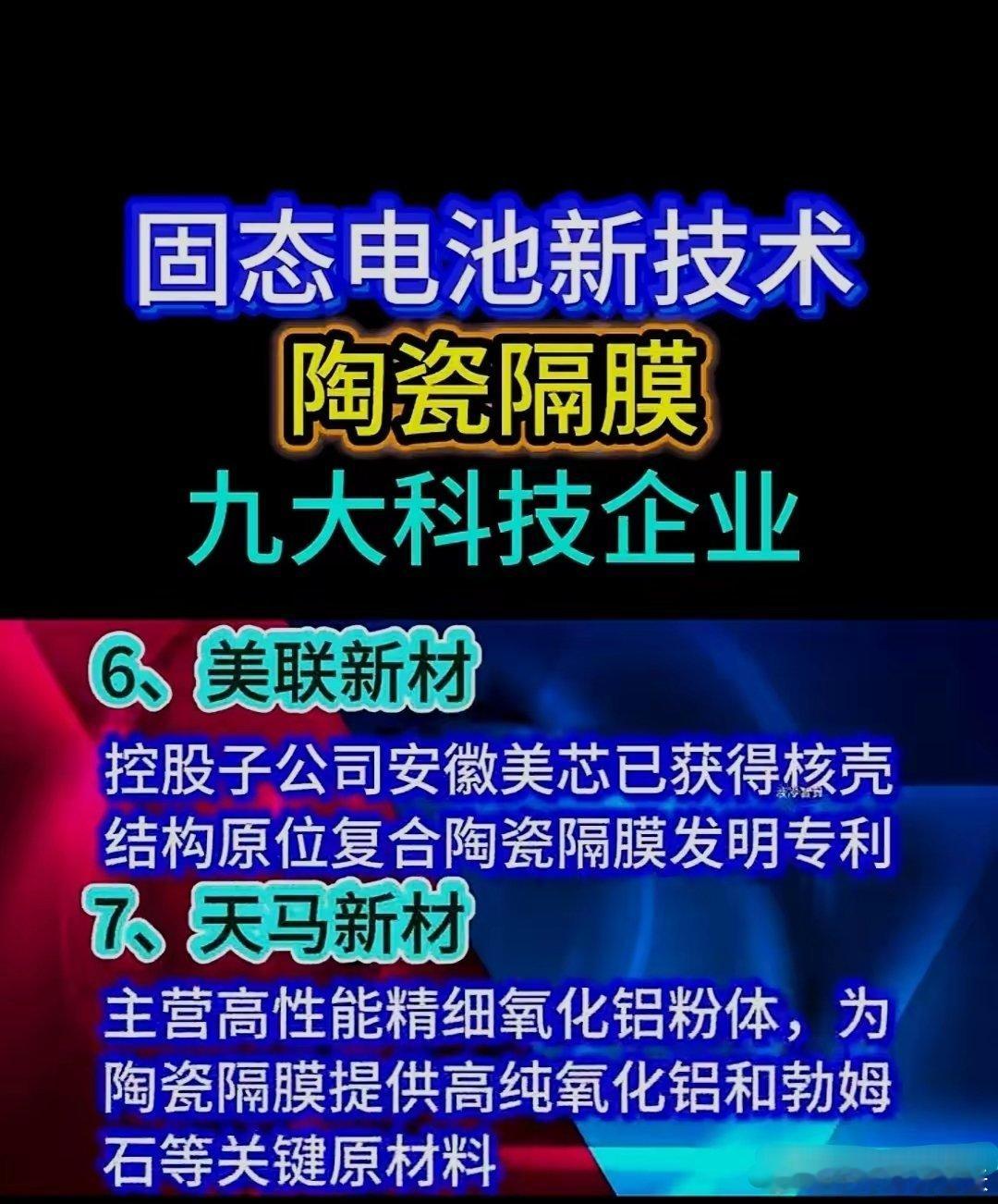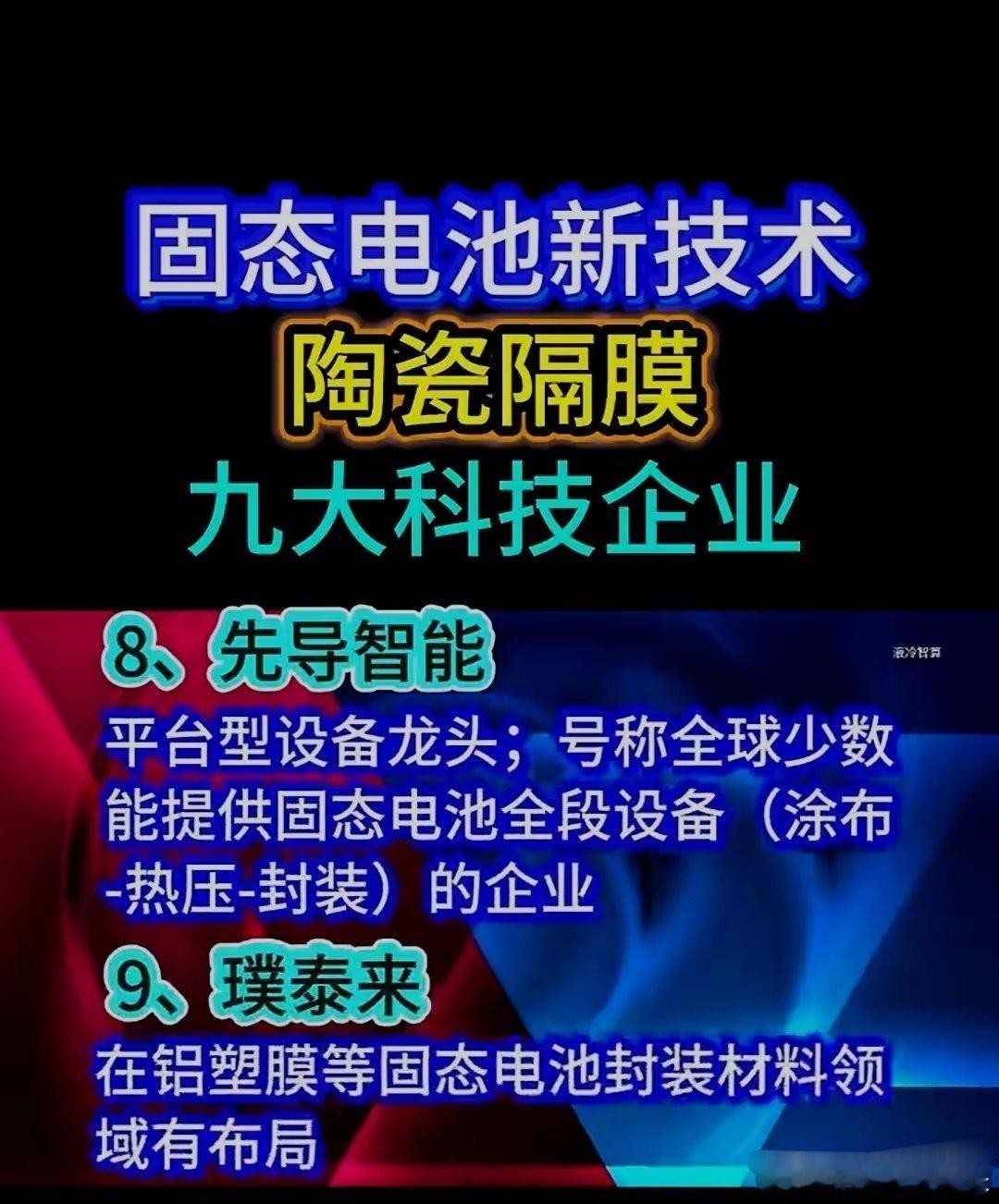 固态电池新技术——陶瓷隔膜。相关9家前沿科技企业。名单仅供参考,不做投资依据。一,全球少数能够提供固态电池前端设备的先导智能。二,在铝塑膜等固态电池封装材料领域领先的璞泰来。三,控股子公司获得核壳结构原位复合陶瓷薄膜发明专利的美联新材。四,主营高性能精细氧化铝粉末的天马新材。五,薄膜产品可用于多种电解质路线的长阳科技。六,国内领先的锂电池隔膜企业,沧州明珠。七,拟收购金力股份布局凝胶电解质涂层隔膜技术的佛塑科技。八,刚性骨架支撑+电解质复合膜的星源材质,九,全球隔膜龙头、陶瓷涂层与硫化物固态电解质已实现小批量生产的恩捷股份。