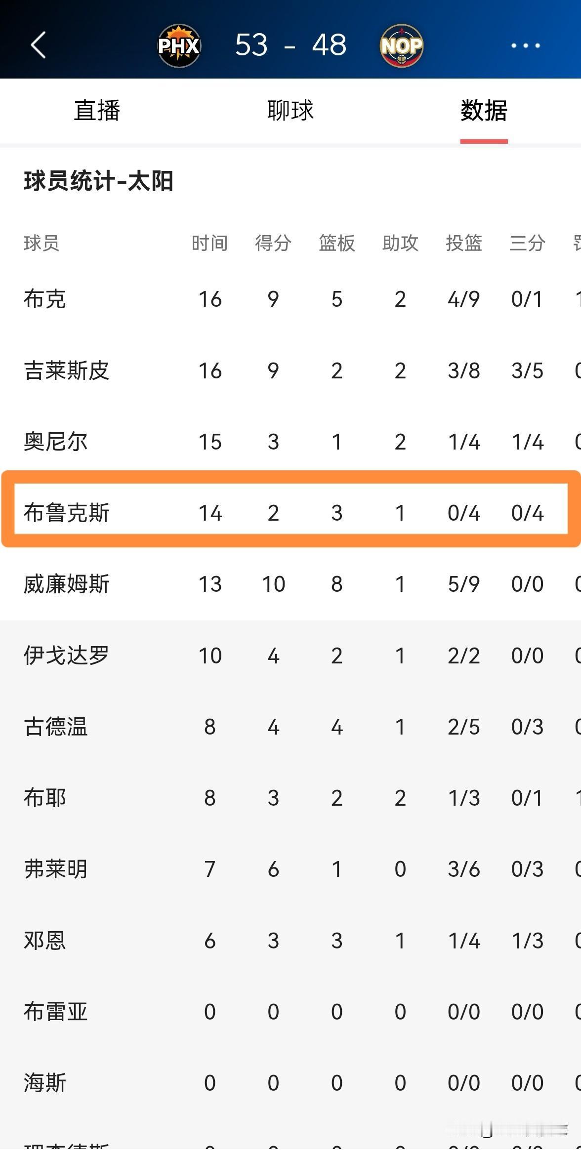 太阳球星狄龙-布鲁克斯终于不嚣张跋扈了!在今天太阳客场挑战鹈鹕的比赛中,目前双方半场战罢,太阳以53:48领先对手。让人大失所望的是,狄龙在前两节比赛中手感冰凉,他在首发出战的14分钟里,三分球4中0,仅仅依靠罚球得到2分,还有1次失误和1次犯规。 由于自己的投篮手感非常糟糕,因此狄龙在上半场比赛中显得非常安静,他不像以往那样嚣张跋扈。