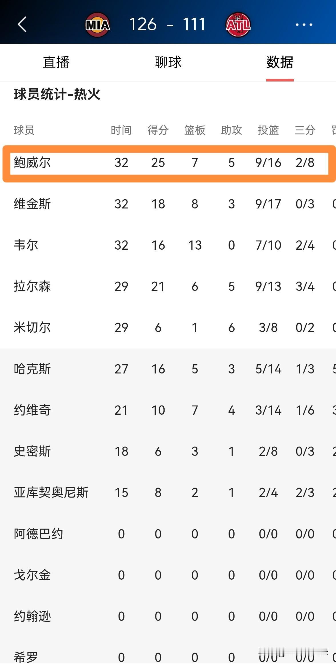热火球星鲍威尔不愧是球队的头号得分手!在今天热火客场以126:111击败老鹰的比赛中,鲍威尔再次展现出了超强的得分能力。 全场比赛下来,鲍威尔首发出战32分钟,投篮16中9,其中三分球8中2、罚球5中5轻松砍下25分7篮板5助攻1抢断。 毫不夸张的说,以鲍威尔在本赛季的出色表现来看,他绝对值得入选全明星,他的得分能力在东部二号位上堪称顶级。