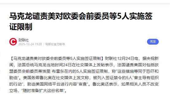 美国和欧盟这对老盟友直接闹到了“拉黑制裁”的地步,因为特朗普政府干了件让欧洲人彻底炸毛的事,公开宣布把5个欧盟高官和相关人士拉进签证黑名单,不准他们踏入美国半步。   理由说得冠冕堂皇,说这些人“不公平针对美国科技公司”,可明眼人一看就知道,根源是在马斯克和他的X平台上。   前不久欧盟刚依据《数字服务法案》,给马斯克的X平台开出了1.2亿欧元的罚单,这笔钱折合成美元差不多1.3亿,直接戳中了马斯克和特朗普政府的痛处。   要知道这张罚单不是凭空而来,欧盟核查后发现X平台的多项操作都违规,比如付费就能拿到的“蓝色勾号”认证,在界面设计上误导用户判断,广告资料库的透明度和可访问性也不达标,甚至没按规定给符合条件的研究人员开放平台公共数据访问权限。   马斯克当时就在自己的X账号上怒怼,直言“欧盟应该解散”,这番抱怨很快就传到了特朗普政府耳朵里。   本身就对欧洲数字监管政策不满的白宫,这下算是找到了发泄的由头,直接把账算在了推动相关法规的欧洲人士身上。   被拉黑的5个人里,领头的是欧盟前委员会委员蒂埃里·布雷东,正是他主导推进了《数字服务法案》的落地,这套法规要求大型科技平台必须主动清理非法和有害内容,不然就面临巨额罚款,算是掐住了美国科技巨头在欧洲运营的命脉。   除了布雷东,另外4人也都是欧洲打击网络虚假信息和仇恨言论的核心人物,有英国“反击数字仇恨中心”的首席执行官,还有德国相关公益组织的成员以及英国虚假信息研究机构的负责人。   美国国务卿鲁比奥还特意在X平台上放话,指责这些人搞有组织行动,胁迫美国平台惩罚他们不认同的美国观点,宣称特朗普政府绝不会再容忍这种越权审查行为,甚至放狠话要随时扩大制裁名单。   这番操作直接让欧洲各国炸了锅,法国总统马克龙第一时间就发声谴责,在社交媒体上明确表示美国的签证限制等同于恐吓和胁迫,还专门给布雷东打了电话表达支持,强调欧洲不会放弃数字主权,不会让别人来定自己数字空间的规则。   布雷东本人也不甘示弱,在X上回怼美国,质疑这种做法是不是麦卡锡主义卷土重来,还特意澄清所谓的审查根本不是美国说的那回事,《数字服务法案》本身就获得了广泛支持。   欧盟委员会也迅速作出回应,明确表态如果有必要会果断反击,坚决捍卫自身的监管自主权,不会屈服于这种不正当措施。   德国司法部直接站出来为被制裁的本国人士撑腰,称美国的禁令完全不可接受,英国和西班牙也纷纷谴责美方行为,强调打造安全的数字空间、清除非法内容是欧洲民主的基本价值,轮不到美国指手画脚。   就连美国内部也有不同声音,有议员公开抨击这项禁令,指出被针对的机构其实一直在打击反犹主义和危害儿童的不良内容,根本不存在所谓的恶意审查。   说穿了,这场盟友反目的闹剧,本质就是美欧之间的数字主权之争。欧盟这些年一直在推《数字服务法案》《数字市场法案》,就是不想被美国数字巨头牵着鼻子走,之前已经给谷歌开过失29.5亿欧元的反垄断罚单,还对元宇宙、亚马逊等企业展开过合规审查。   而美国则想保住自家科技企业的全球霸主地位,动辄拿贸易手段施压,之前就曾威胁要把数字监管问题和钢铝关税挂钩,逼迫欧盟调整规则。   更讽刺的是,美欧本就因俄乌问题、移民政策存在分歧,美国最新的国家安全战略报告甚至警告欧洲面临“文明消亡”的风险,认为欧洲要纠正当前发展轨迹。   如今这场签证制裁风波,更是让跨大西洋盟友关系雪上加霜。欧洲不少政客都清醒过来,意识到美国早已不把欧洲当成平等盟友,反而更像想掌控的“附属品”。这场争端说到底没有赢家,美国强行施压只会让欧洲更坚定推进数字自主,而双方的裂痕,恐怕短时间内根本无法弥合。