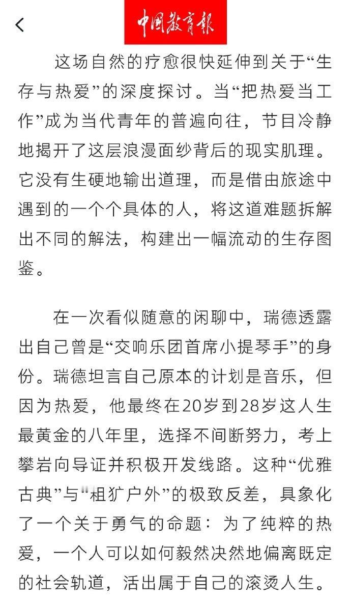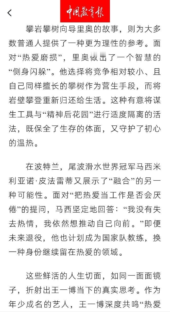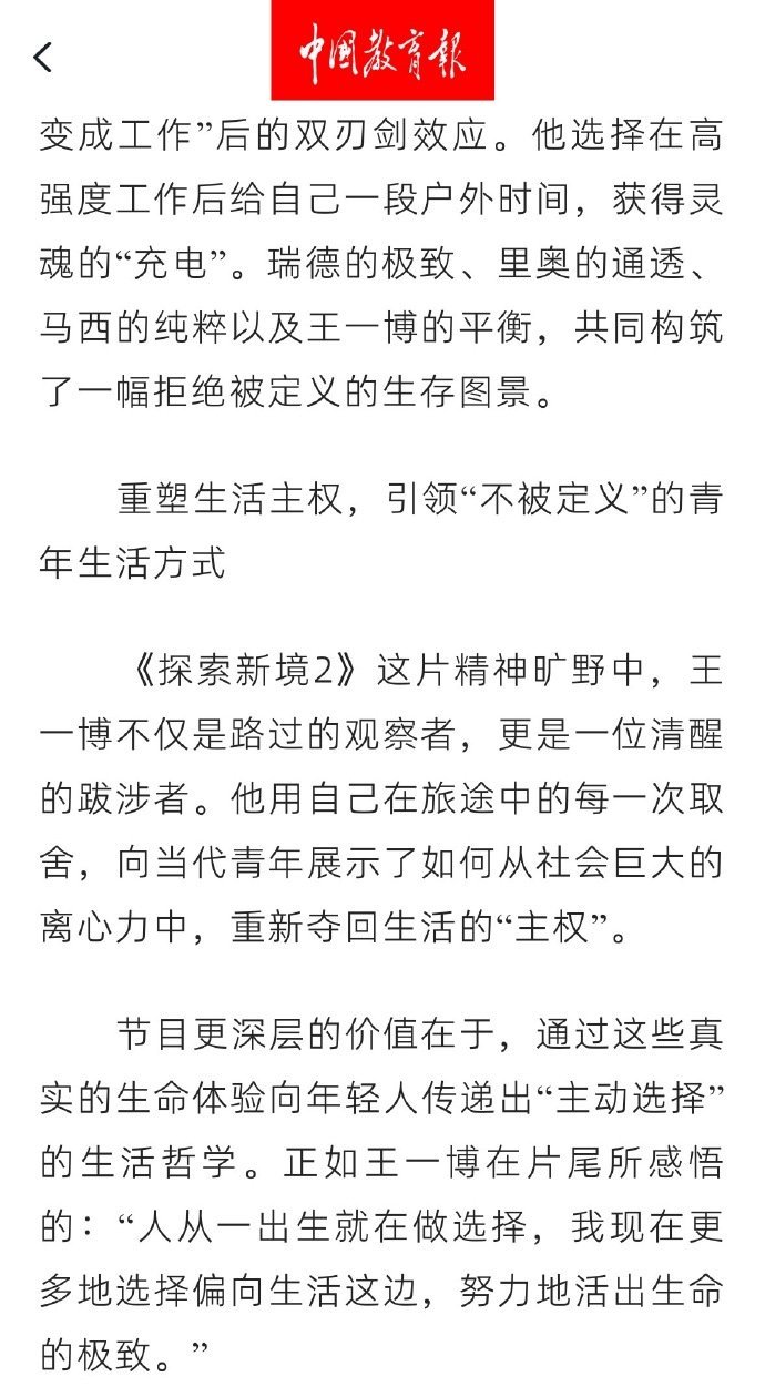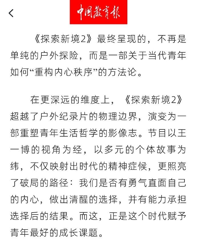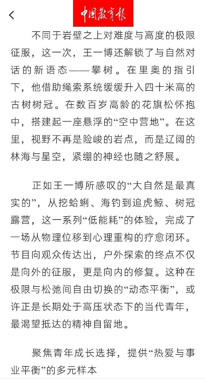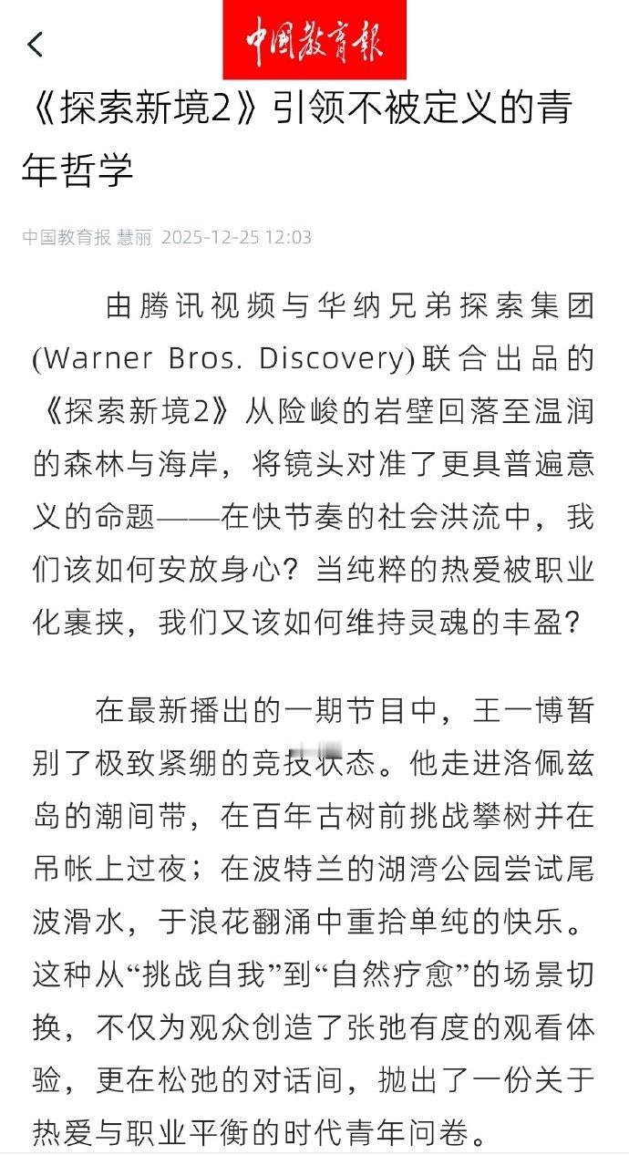中国教育报盛赞王一博 王一博在《探索新境2》中,从极限竞技走向自然疗愈,于攀树、滑水中寻回纯粹的快乐。节目通过他与向导、冠军的对话,直面“热爱成为职业”的当代命题。它不再只是冒险纪录,而成为一部青年生活哲学:在紧绷的世界里,如何主动选择、保持平衡,守护内心的丰盈与热爱。王一博以他的旅程诠释,真正的探索是夺回生活主权,活出不被定义的自己💚王一博