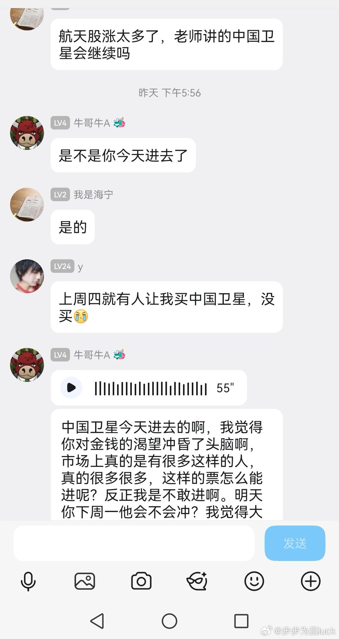 中国卫星,12月23日大阴线后又是三个涨停板。我虽然在12月23日大跌的时候说了不会死,大概率会有反弹甚至反包,但是真没想都还有三个涨停。更没想到的是,我的一位群友在忍无可忍的情况下,昨天杀了进去,问我还能涨吗?其实,我觉得在打板的时候,你一定要想清楚,第二天跌了怎么处理,是一割了事还是坚持到底。对于中国卫星,我认为是凶多吉少,航天航空经过游资恶炒后,未来必将踏慢慢熊途。欢迎加入我们的免费交流群财经股票