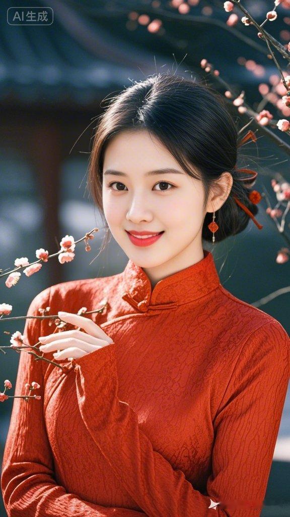 春日暖阳下,红衣少女与樱花相映成趣,笑靥如花。