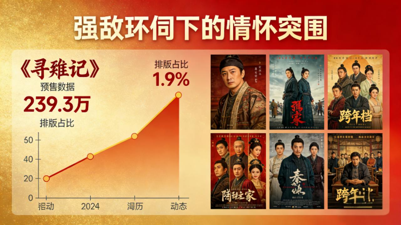 6年7次调档,预售239万垫底!《寻秦记》是港片倔强还是生不逢时? 2025跨年档厮杀正酣,一部承载24年青春记忆的电影《寻秦记》却陷入尴尬境地。原班人马重聚的情怀牌没能立刻转化为票房优势,预售仅239.3万,排片占比16.9%却只有1.4万场,面对《阿凡达3》《匿杀》等强敌,这部耗资3.5亿港元的港片,究竟是生不逢时还是潜力未发? 说它“生不逢时”,绝非空穴来风。2025年影视寒冬持续发酵,投资方收缩战线,港片更是集体遇冷,全年多部作品票房折戟,古天乐几乎以一己之力扛起港片大旗。而跨年档集结了40余部影片,热门档期资源被头部大片瓜分,《寻秦记》6年7次调档的波折履历,也让部分观众持观望态度。更关键的是,当下观众对IP改编要求愈发苛刻,既想看到情怀复刻,又渴望创新突破,稍有不慎就会被贴上“炒冷饭”标签。 但这部电影的逆袭底气同样十足。作为穿越剧鼻祖,剧版8.6分的豆瓣高分是天然护城河,“原班人马重聚”话题4小时冲上热搜第三,阅读量破3亿,想看人数已破10万。制作上,2000多个特效镜头实现“现代科技VS战国权谋”的类型升级,洪金宝团队操刀的动作戏融合古今格斗,满足了新老观众的双重期待。更重要的是,跨年档30%观众是24岁以下年轻人,青春回忆感恰好契合跨年观影的情感需求,往年单日票房峰值超7亿的市场体量,为其留足翻盘空间。 其实,《寻秦记》的处境正是当下IP改编电影的缩影:情怀是敲门砖,创新才是续航力。它既要对抗影视寒冬的市场压力,又要打破观众的情怀滤镜,难度可想而知。但正如古天乐所言“时光未改,项少龙的剑还在”,这份坚守或许能创造惊喜——毕竟跨年档的核心是情感共鸣,而24年的青春回忆,从来都自带爆发力。 你会为这份青春情怀走进影院吗?港片能否靠《寻秦记》在跨年档逆袭?欢迎在评论区留下观点。