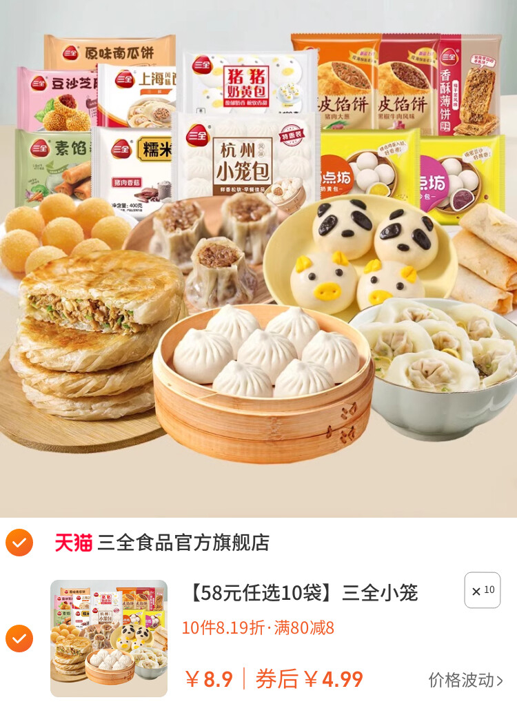 【🔥49.9】三全小笼包烧麦豆沙奶黄包方便速食馅饼肉饼早餐任选10件!方便快捷,营养满满!口味多样,满足全家!