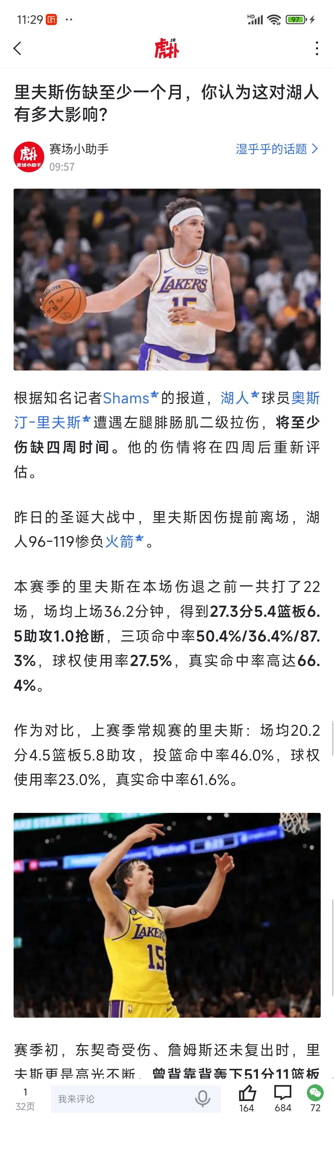 东契奇刚复出1场,里夫斯就受伤。 詹姆斯其实也没打多少场,三巨头一个接一个的受伤。 这样也好,球权能分配,合理打球。 等到季后赛千万别伤了![思考]