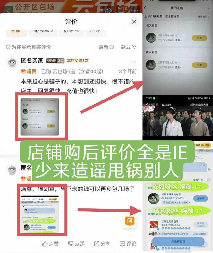 如果还有人不知道昨天发生了什么,来看详细解释成毅大粉包括以飞升顶流为主的营销号突然搬运了一张淘宝店铺的“战报”,声称内娱十几部大剧都在这个店铺买了一折云包场,加起来高达66万场,这个店铺的好评区只有成毅粉丝,但战报上唯独没有成毅的《赴山海》,《天地剑心》和《长安二十四计》各家粉丝发现店铺月销量几千年销量不过2万,和所出战报里的66万完全对不上,质疑店铺造假要查税,商家慌不择路删掉假战报下架所有链接还威胁各家粉丝,后续改名被成毅粉丝造谣的大剧云包场包括肖战《藏海传》10万,《折腰》+《书卷一梦》,一共12万,刘宇宁粉丝做的云包场;檀健次《滤镜》+《猎罪图鉴》,一共8万;王鹤棣《大奉打更人》6万,邓为《仙台有树》5万,白鹿《临江仙》5万,许凯《子夜归》4万,刘诗诗《淮水竹亭》4万,杨幂《生万物》3万