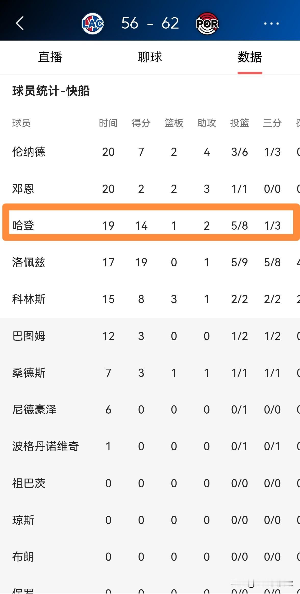 快船当家后卫哈登真是太想赢了!在今天快船客场挑战开拓者的上半场比赛中,哈登从开场以后就展现出了超强的赢球欲望,他在前两节比赛中首发出战19分钟,投篮8中5,其中三分球3中1、罚球3中3得到14分1篮板2助攻。 虽然快船在上半场比赛结束时以56:62落后对手,但是哈登是快船阵中最想赢球的球员之一。