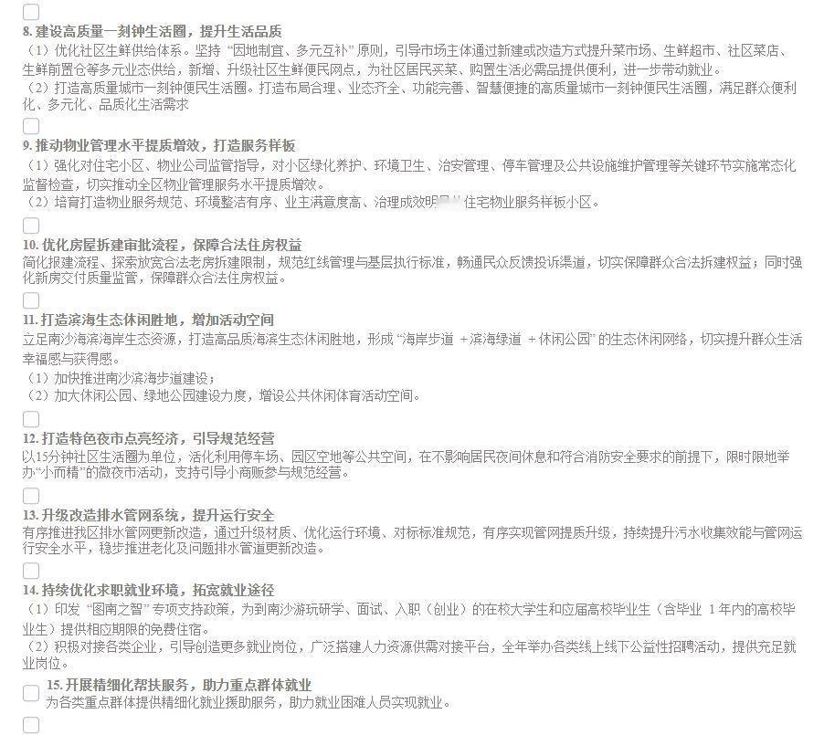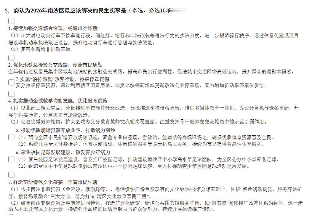 【2026年南沙十件民生实事第二轮“票选”正式启动】2026年南沙区十件民生实事第二轮“票选”活动正式启动,12月25日至31日市民可通过网站、邮件等多种方式,从候选事项中选出心目中最急难愁盼的事项。共同推选2026年南沙区十件民生实事。 本次候选事项主要来自第一轮无导向公众意见征集活动、区12345政务服务便民热线、区人大建议、区政协提案、区政府年度重点工作内容及各镇街代表意见建议。经分类梳理,形成了涵盖公共交通、文化教育、住房保障、环境整治、就业保障、公共卫生和基本医疗、社会保障、食品和药品安全、社会治安、济困扶危等十大民生领域的27件候选事项。 其中有好几点都是南沙人十分关注的大事,比如“优化地铁站接驳公交线路,便捷市民通勤”这个就很戳中痛点,另外实施"泊位惠民"攻坚行动,挖掘停车资源也十分的贴心。还有推动全域教学均衡发展,优化北三镇教育设施也十分的贴合市民诉求。另外“推动物业管理水平提质增效”这个也是一直都是市民强烈的诉求。还有“优化求职就业环境,拓宽就业途径”也是很有看点。 最后还有包括打造特色夜市点亮经济, 关心南沙的南沙人们快点去投票吧!没准真的能实现了呢?