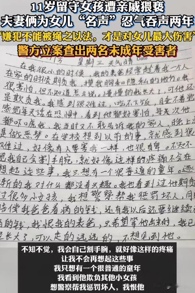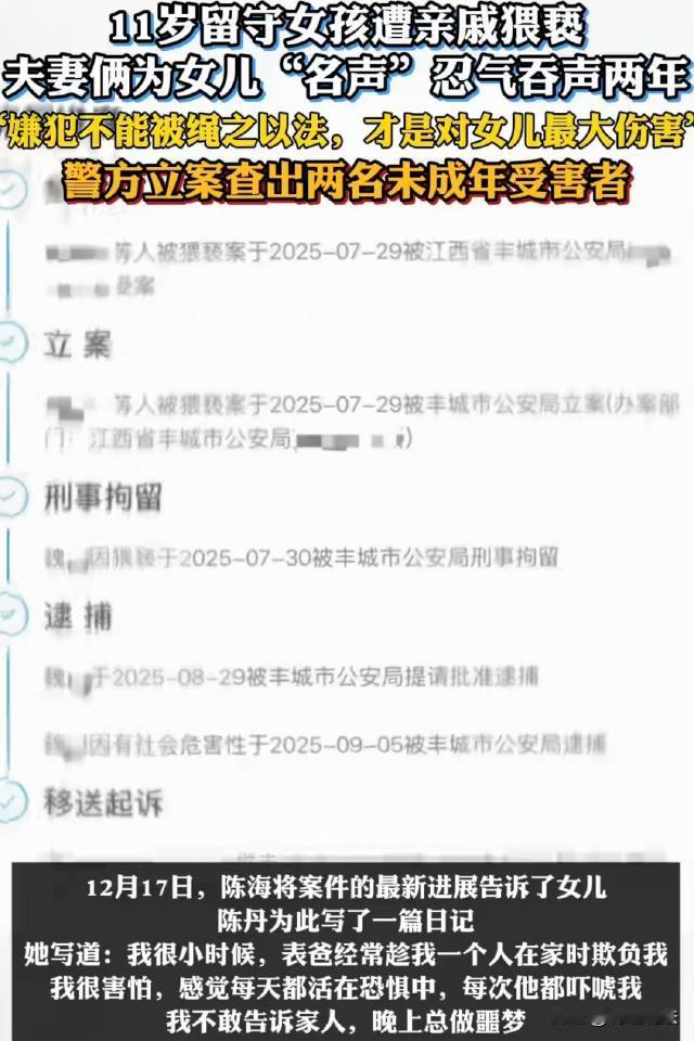 江西丰城,11岁女孩丹丹是留守儿童,邻居兼亲戚魏某多次对她实施猥亵,丹丹告诉爷爷奶奶,他们认为双方是亲戚,隐瞒下了此事。女孩父母得知后,妈妈执意要报警,爸爸觉得丢人阻止妻子,还对妻子实施家暴,整个家几乎分崩离析。两年后,丹丹爸爸终于决定站出来讨公道,可事隔两年,证据都找不到了,然而这时候丹丹突然说出一句话,案件迎来转机。 据大风新闻报道,陈海是1990年生人,家住丰城市某村,出事的是他的女儿丹丹。 丹丹出生于2012年,自从孩子出生后,家里负担越来越大,陈海就和妻子外出打工,女儿放在老家由父母照顾。 2023年8月,陈海的妻子趁着放暑假回去陪孩子,可一天她带女儿出去玩时,女儿突然对她说身体不舒服,想去检查。 陈海的妻子听女儿说的不对,赶紧询问公婆到底怎么回事,公婆见瞒不下去了,这才说出了实情。 原来,8月的一天晚上,他们有事出去了,11岁的丹丹一个人在家,回家时他们发现丹丹在哭,追问丹丹才知道,刚刚邻居兼亲戚魏某过来,对丹丹实施了猥亵。 而据陈海说,魏某比他大个一两岁,两家人平时走得很近,他没想到魏某竟然会对自己女儿做出这种事。 陈某的妻子得知女儿被欺负了,血气顿时涌上脑门,当即要去找魏某拼命,可是公婆拦着她不让去。 丹丹事后告诉她,说这件事发生后,爷爷奶奶叮嘱她,说和魏某是亲戚,不让她把这件事告诉爸爸妈妈。 陈海和妻子立即带着女儿去做了检查,结果显示丹丹私处有些红肿和充血,没有进一步的侵害。 带着女儿检查完,夫妻俩接到魏某家打来的电话,他们说愿意赔偿医疗费,希望夫妻俩不要报警,也不要声张。 陈海觉得,这件事吃亏的是女儿,如果说出去太丢人,对女儿以名声也不好,决定不报警。 陈海的妻子不同意,认为必须要让坏人得到惩罚,并且,女儿丹丹也希望为自己讨个公道。 陈海的妻子纠结了一星期还是报了警,但是因为陈海和家人都不同意,最终未能立案。 因为这件事,陈海和妻子之间产生了很多矛盾,夫妻俩经常吵架,陈海甚至还为此多次家暴妻子,导致妻子精神出现问题,女儿也因为这件事出现抑郁、自残情况。 不久,妻子娘家得知了陈海家暴自己家女儿的事,要求陈海和妻子离婚,陈海为此还受到了刑事处罚,家庭即将分崩离析。 出狱后,陈海做了很长时间的思想斗争,终于意识到妻子是对的,自己的退缩只会再次伤害到妻子和女儿,于是,陈海决定为女儿讨回公道。 但是,此时距离案发已经过去了两年,证据早就找不到了,立案并非易事。 丹丹突然说,被魏某猥亵的未成年女孩有很多, 她并不是唯一一个。 2025年7月29日,丹丹被魏某猥亵一案成功立案。 丹丹的父母配合民警做笔录时才知道,原来魏某不止一次猥亵丹丹,而是多次。 在民警调查过程中,大多数受到魏某迫害的孩子不愿意站出来,但是有个比丹丹大3岁的女孩出来指认了魏某。 据了解,魏某大多数时候,以买零食引诱未成年女孩,然后对她们实施猥亵。 9月5日,魏某被逮捕,11月4日,民警将魏某移送检方审查起诉。 而检方又查明,魏某猥亵丹丹,其实早在2021年就开始了。2021年的7到8月间,魏某先后三次在车里对丹丹和另一名未成年女孩实施猥亵。 那么,魏某会受到什么处罚? 魏某以买零食引诱等方式,多次对丹丹等多名未成年女孩实施猥亵行为。 根据《刑法》第二百三十七条规定,以暴力、胁迫或者其他方法强制猥亵他人或者侮辱妇女的,处五年以下有期徒刑或者拘役;聚众或者在公共场所当众犯前款罪的,或者有其他恶劣情节的,处五年以上有期徒刑;猥亵儿童的,依照前两款的规定从重处罚。 魏某的行为存在诸多从重处罚的情节。 首先,他的侵害对象为多名未成年人。未成年人身心发育尚未成熟,自我保护能力较弱。 魏某将罪恶之手伸向这些无辜的孩子,严重影响了他们的身心健康和正常成长,这种针对弱势群体的犯罪行为应当受到法律的严厉制裁。 其次,魏某实施猥亵行为的时间跨度较长,早在2021年7到8月,就先后三次在车里对丹丹和另一名未成年女孩实施猥亵,之后还多次对丹丹进行猥亵,持续的犯罪行为反映出其主观恶性较大。 根据《关于依法惩治性侵害未成年人犯罪的意见》,对于猥亵儿童犯罪,应当依法从严惩处。 结合魏某的犯罪事实和情节,他很可能会在法定量刑幅度内被从重处罚。 由于魏某猥亵多名儿童且多次实施犯罪行为,属于有其他恶劣情节,按照刑法规定,可能会被判处五年以上有期徒刑。 目前,检方仍在审查办理此案。 陈海将案件最新进展告诉了丹丹,丹丹在日记里写,表爸(即魏某)在她一个人在家的时候经常欺负她,她不敢告诉家人,晚上经常做噩梦,后来学会了割手腕,她想让魏某受到惩罚,她恨他。
