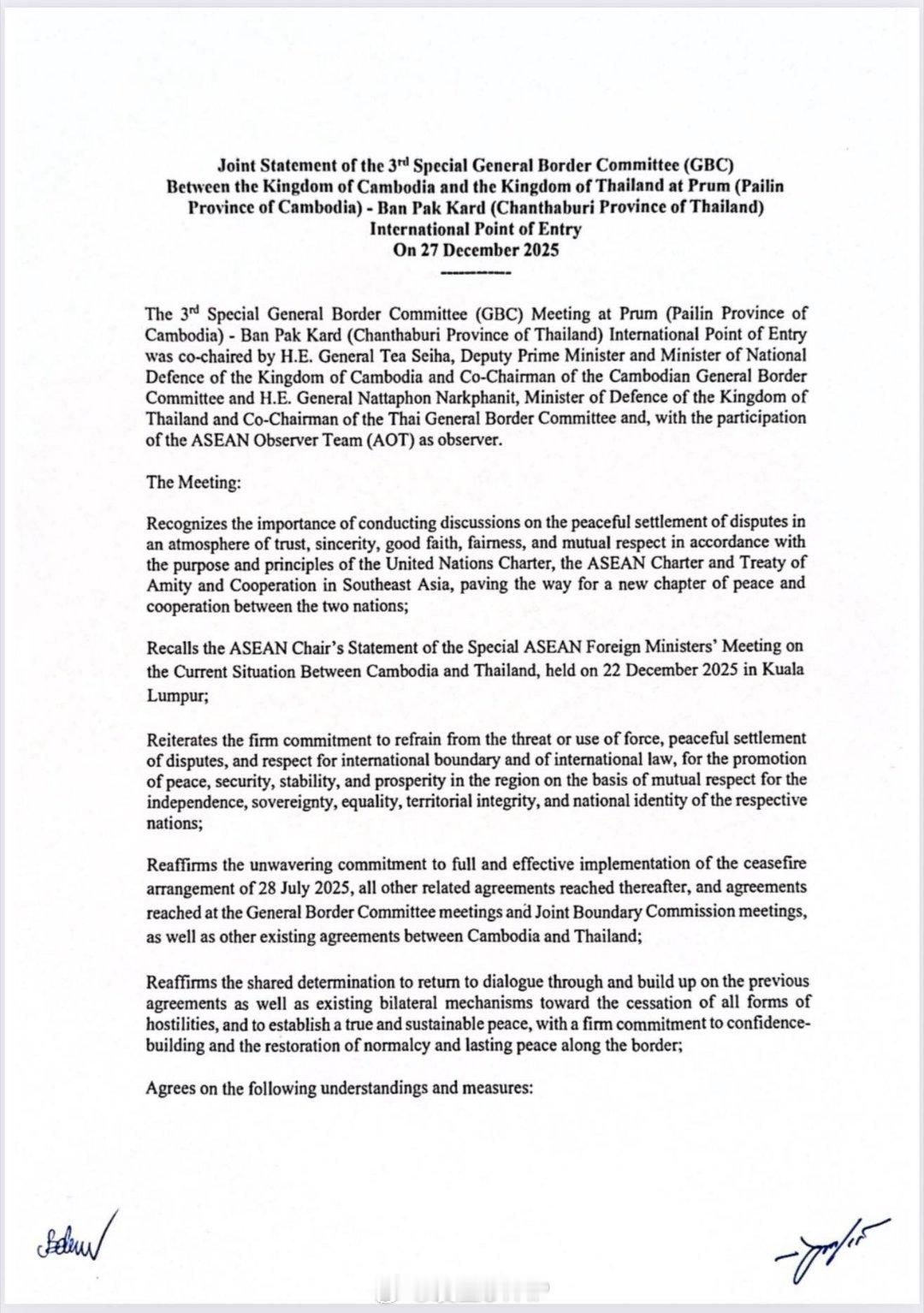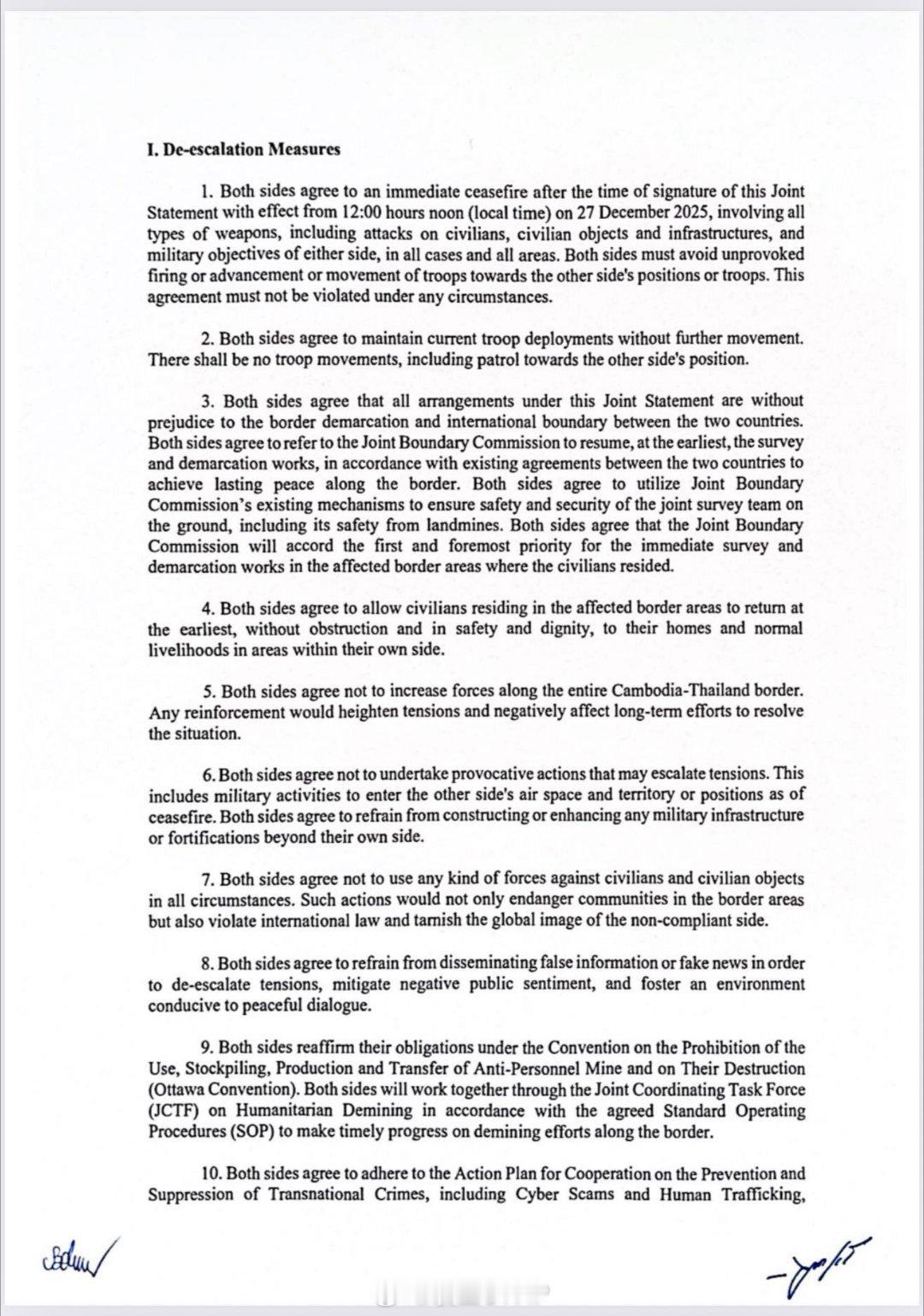 泰国柬埔寨签署停火协议看看停火协议能管多久?今天,泰国和柬埔寨两国国防部长在泰国尖竹汶府边境口岸就停火问题签署协议,双方同意从12月27日中午12点起停火。双方同意停止一切袭击,包括针对平民和民用基础设施的袭击,并冻结部队阵地,不再进行任何调动或增援。该协议承诺两国缓和局势,允许流离失所的平民安全返回家园,避免采取挑衅行动、侵犯领空和散布虚假信息,并尊重国际法和边界。东盟观察员小组将监督协议的执行情况,并已建立协调机制和直接军事沟通渠道。