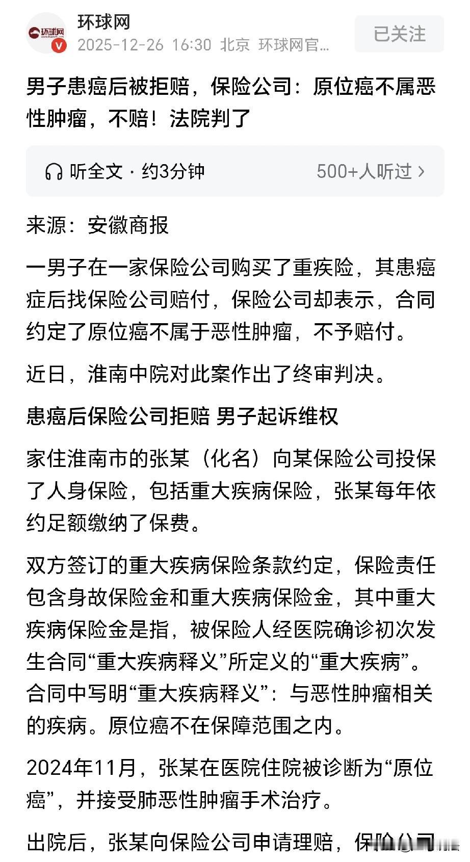干的漂亮! 安徽淮南,一男子购买了重疾险,每年足额缴纳保费,他身体不适,到医院一查,被诊断为肺部原位癌,医生给他做了手术,男子出院后找保险公司理赔,谁知被保险公司拒绝,说原位癌不属于恶 x 肿瘤,不予赔付,男子告到法院,要求保险公司赔偿150000元,法院判了! 2024年11月,张某感到身体不适,他到医院一查,竟然被查出来肺部患上了癌症。 这消息让张某难以接受,顿时感到天塌地陷,可万幸中的万幸,经过诊断,癌症并没有扩散,只是在肺部出现的原位癌症。 这种癌症,属于早期,经过治疗,不会有太大的问题。 张某办理了住院手续,医生立刻给他安排了手术,经过一系列的治疗,张某身体逐渐的恢复。 之后张某出院,他暗自庆幸,虽然治疗费非常的昂贵,可是他早就已经做好了准备。 之前他曾考虑,自己是家里的顶梁柱,万一有个重大疾病,自己的家庭将无力承受。 于是他早早就在某保险公司,购买了一份人身保险,其中也包括了重大疾病险。 买完之后,张某按照保险的约定,每年按期缴纳足额的保险费用。 重大疾病险里约定,被保险人经过医院的确诊,初次发生合同重大疾病释义所定义的重大疾病。 所谓重大疾病,就是与恶 x 肿瘤相关的疾病,但是条款里还写明,原位癌不包含在重大疾病范畴之内。 可张某签约时并没有细看,他也没有预见到自己患上的正是原位癌症。 于是他准备好了资料,向保险公司申请赔偿,可是万万没有想到,保险公司拒绝理赔。 保险公司认为,张某被确诊为肺部原位癌,并不符合保险合同里约定的重大疾病。 因此,保险公司拒绝给张某进行保险理赔。 张某懵圈,怎么买保险时说的天花乱坠,理赔时就是这不赔那不赔? 原位癌也是癌,如果不是重大疾病,那这个疾病就不会带有癌字。 既然是癌,为什么不属于恶 x 肿瘤? 张某一气之下,将保险公司告到了法院,要求保险公司按照约定支付给他150000元保险金。 可保险公司认为,条款中规定,所谓恶 x肿瘤是指癌细胞已经增长扩散,破坏浸润和转移到其他正常组织的疾病。 并且,还必须要经过病理学检测,明确诊断属于卫生组织标准的恶 x 肿瘤范畴。 那么究竟什么叫做原位癌症?原位癌是一种早期癌症,它的癌细胞局限于上皮层内,未突破基底膜,也没有发生浸润和转移,对身体的危害性相对较小 也就是说,张某所患的癌症肿瘤,只是处于原位癌症,并没有扩散侵润,也没有破坏转移到其他正常组织。 因此保险公司认为,张某所患的疾病并不属于恶 x 肿瘤,因此不能获得理赔,保险公司并没有错误。 保险公司还表示,这个条款并不是特别为减轻责任而特别设置的,绝对符合规范要求。 张某听了眼都红了,自己买保险时,哪里能看懂这么多的规定,并且那些专业的术语,在他这样的外行人的眼里,根本就不懂,也看不明白。 自己之所以购买保险,就是为了能保自己的平安,能在患上重大疾病时得到及时的赔付。 如今自己患上了癌症,万幸的是癌症还没有扩散,但是没扩散的也是癌症,因为身体里已经有了癌症的病灶。 《民法典》第496条规定:提供格式条款的一方,应当采取合理的方式提示对方注意免除或者减轻其责任等与对方有重大利害关系的条款,并按照对方的要求,对该条款予以说明。 法院审理认为,保险合同里的确是有条款的约定,也的确是写了原位癌不赔的字样。 但保险公司合约里的条款极其复杂专业,普通人根本就看不明白其中的专业术语。 张某经过医院的诊治,被确诊为原位癌症,虽然相对来说,原位癌对身体的损害较小。 可是在普通人的眼里,癌症就是癌症,如果没有专业人员的解释,根本不能理解其中有什么分别。 保险公司必须用特别明显的方式,比如把该条款字体进行加粗处理,或者加大字号等方式方法引起投保人的注意,还必须使用能让普通人看明白的文字。 也就是说,保险公司必须确保投保人签合同前就搞明白这条免赔条款的含义和后果。 如果保险公司没有做到这一点,那么该条款就属于无效条款。 但保险公司拿不出证据来证明公司对原位癌术语已经做出了普通人能理解的解释。 因此法院认为,保险公司没有对该条款履行明确说明的义务。 因此一审判决,该条款无效,保险公司应该赔偿。 保险公司不服,提起了上诉。 《民法典》第498条:对格式条款的理解发生争议的,应当按照通常理解予以解释。 对格式条款有两种以上解释的,应当作出不利于提供格式条款一方的解释。 二审法院认为,保险合同是保险公司事先印好的格式合同,里面很多普通人读不明白的专业术语。 保险公司对这些词的定义,不能和普通老百姓的通常理解差太远,更不能故意用专业术 语缩小保障范围。 对于普通大众来说,癌症,恶 X 肿瘤这些词,通常就包含了医学上说的原位癌。 因此,二审判决,维持原判,驳回了保险公司的上诉。 关注@王哥说法 多学法律少吃亏!