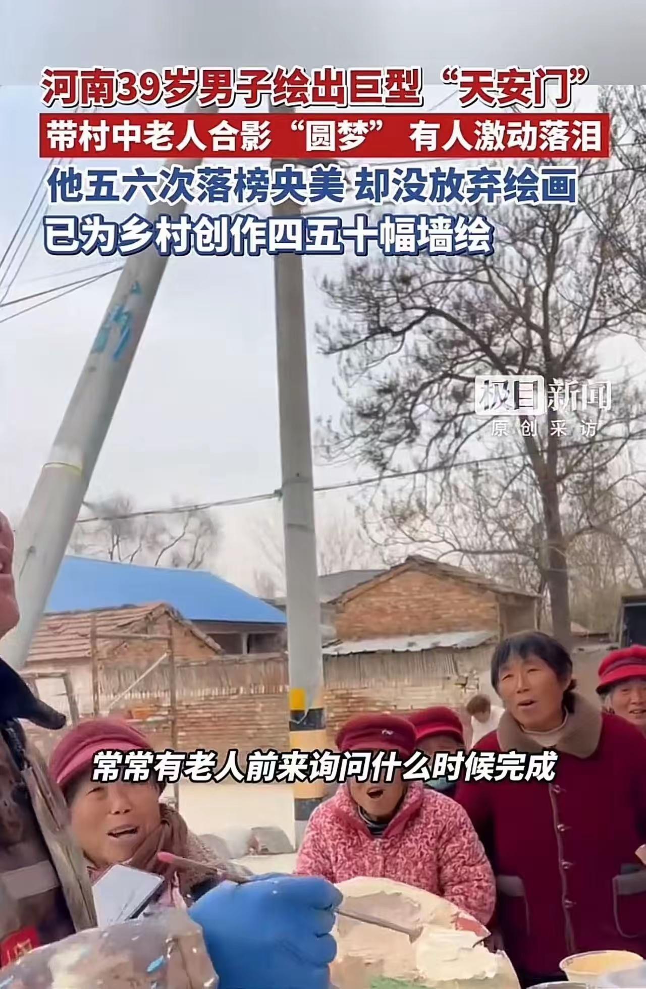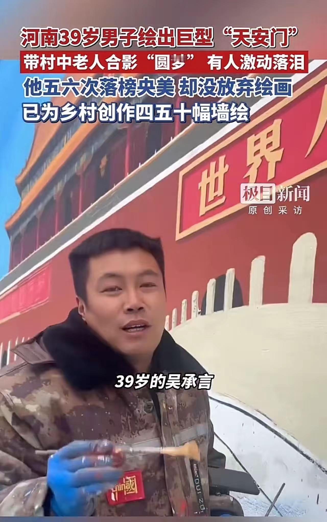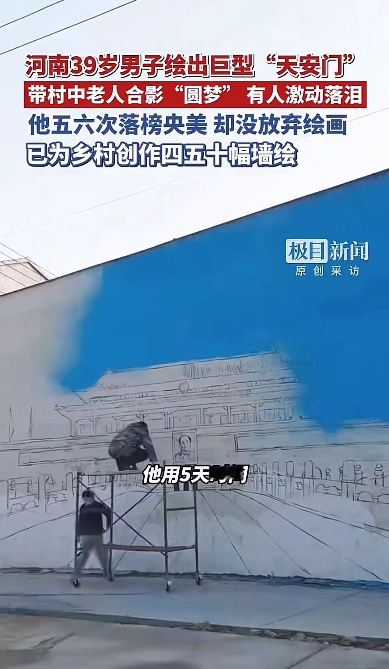 惊爆!河南小村突然炸出“天安门”,竟是落榜5次央美的大哥徒手画的! 我刷到这事儿时差点跳起来!咱村39岁的吴承言,考央美考了好几次都没中,却干了件绝活儿——花5天在村头空墙上,硬生生画了18米长、8米高的天安门!天刚蒙蒙亮就蹲那儿描,天黑透了才肯挪窝,村里老人天天搬着小马扎凑跟前等,眼睛都看直了。 老人们一辈子没出过远门,舍不得花机票钱去北京,就想跟天安门合张影。吴承言这大哥是真走心,直接把“天安门”搬来了!画成那天,老人们穿新衣裳、坐轮椅都来合影,手抖着抹眼泪,攥着照片跟攥着宝贝似的。 画画不为成名赚钱,能帮老人们了却心愿,这才是最实在的暖!这样的真人真事儿,就该被狠狠点赞! 河南大哥5天绘18米天安门 用画笔圆老人北京梦 最暖艺术不追名逐利