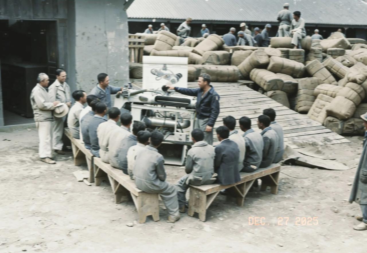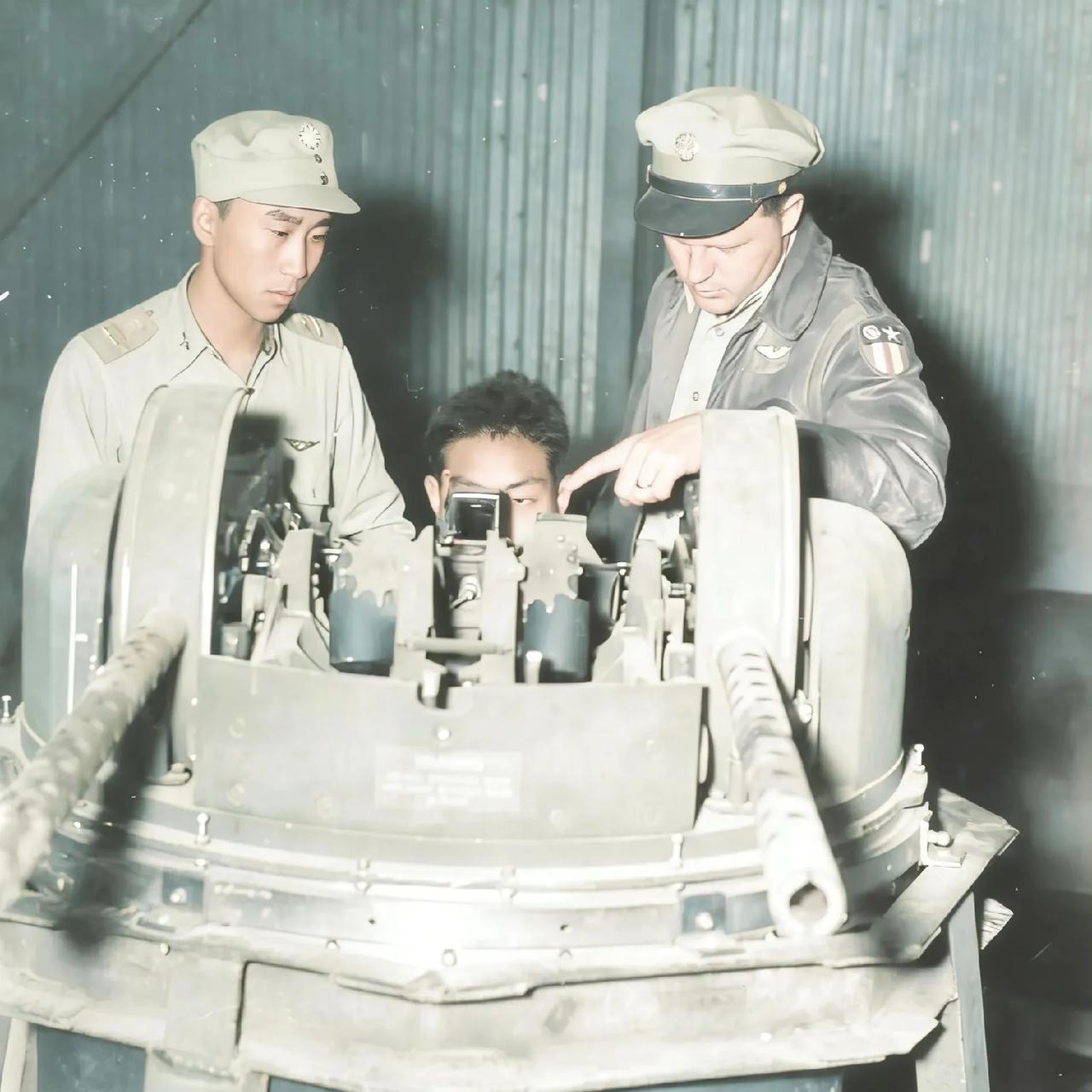 抗战影像录·美第十四航空队给中方空军机务人员教授航空发动机原理。第二张是中方人员在卡拉奇接受美方空中射击训练。