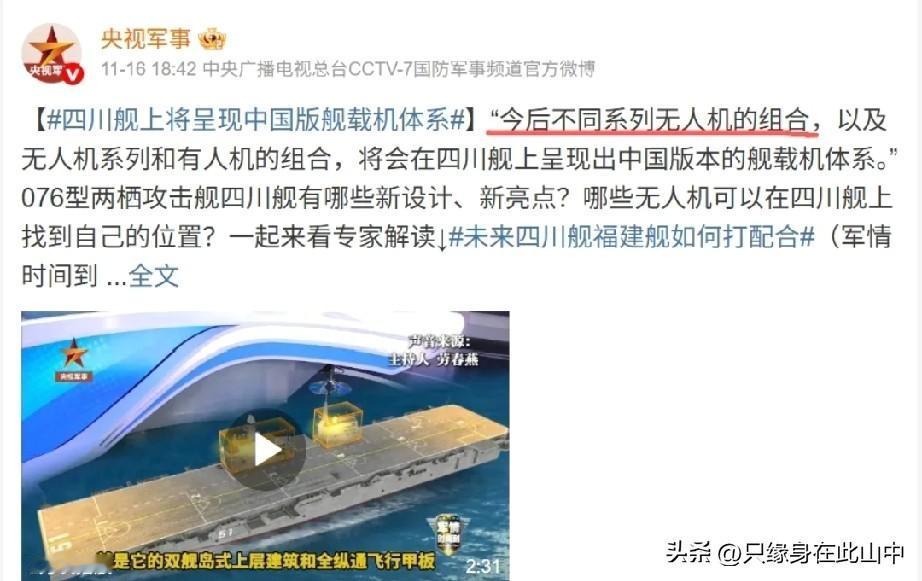 今天“四川舰”下水一周年,如今无人机上舰,常务副航母之称也名副其实了... 老外其实盯得很紧,昨天刚出现的第二款无人攻击机(第一款自然会是攻击21,试飞照早已曝光过),老外就立即跟进报道... 攻击21早有试飞照流出,作为隐身舰载机,14米翼展能折叠,2吨弹舱能装各种制导武器,航程两千多公里。 翼龙-X反潜型之前迪拜航展露过脸,能飞40小时,声呐浮标、轻型鱼雷,跟直20F、直18F混搭,也能水下防护。 现在明显是在补侦察预警和战术支援的短板,作为常务副航母,搞供无人机伴飞舰载机,简直是空中作战陪增器! 巴适滴很...