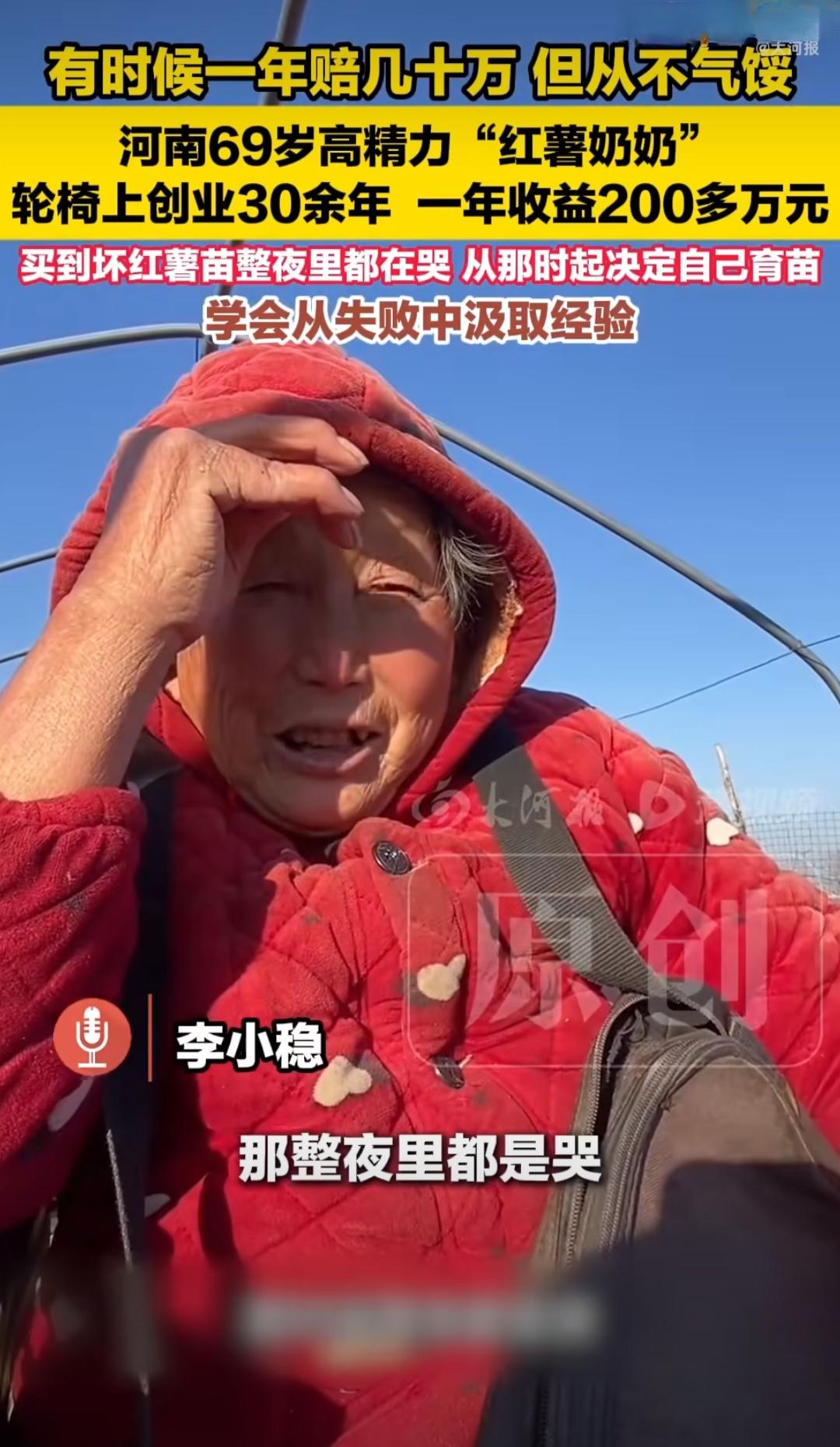 最近河南一位69岁的“红薯奶奶”彻底火了,坐着轮椅扎根田垄三十多年,不仅把几棵红薯苗做成了年入200万的大生意,还带着五十多户乡邻一起致富,这份励志劲头比日本那位坚持卖汉堡几十年的老人还要让人佩服。这位奶奶叫李小稳,被类风湿关节炎缠了二十多年,只能靠轮椅行动,本该在家安享晚年的年纪,却凭着一股“不甘心”的韧劲,在田地里闯出了一片天。 一开始,看着乡亲们种红薯缺品种、没技术,忙活一年也挣不到多少钱,坐着轮椅的李奶奶心里很不是滋味,琢磨着自己虽然腿脚不便,但育苗、管理这些活坐着也能做,于是下定决心搞红薯种植。可创业哪有那么容易,土地流转要一家家上门谈,坐着轮椅跑前跑后从不喊累;贷款时被好几家银行拒绝,她软磨硬泡,终于用坚持打动了工作人员。最让人佩服的是她学技术的狠劲,刚开始就是个门外汉,温度控制、病虫害防治啥都不懂,就每天趴在轮椅上翻专业书,密密麻麻记满好几本笔记,深夜忙完农活还不忘看教学视频。听说邻市有农业专家,她就让家人带着颠簸好几个小时去请教,把每个要点都牢牢记在心里,回来就一头扎进田里反复试验。 创业路上的挫折从没断过,有一次买到劣质苗,辛苦种的苗全枯了,不仅赔了几十万,还遭了不少闲言碎语,有人说她瞎折腾,连路都走不了还想搞种植。那天晚上李奶奶在育苗棚哭了一整夜,可哭完还是咬着牙告诉自己不能放弃。就这样经历几十次失败后,她终于培育出了产量高、味道甜的脱毒红薯品种,后来又建起了粉条、淀粉加工厂,把普通红薯做成了附加值更高的产品,销路也越来越宽。如今她依然保持着“朝五晚十”的节奏,每天天不亮就坐着轮椅去育苗基地,指挥工人栽种、检查苗情,手把手教大家打顶、掐尖的技巧,忙到夜里十点才回家,睡前还得翻几页技术书,生怕跟不上农业技术的更新换代。 自己富起来的李奶奶从没忘了乡亲们,她常说“自己淋过雨,就想给别人撑把伞”,于是牵头成立了红薯种植合作社。她把精心培育的优质苗低价卖给村民,还派技术人员下到田间地头,从施肥时机到病虫害防治,每个细节都耐心指导。收获时节,合作社按市场价回收大家的红薯,还优先收购贫困家庭的产品,彻底解决了村民们“卖薯难”的问题。合作社的加工车间还吸纳了不少村里的妇女,让她们在家门口就能赚到稳定工资,每年光给工人发工资就不少于六十万元,很多困难家庭靠着种红薯、在合作社打工脱了贫。 现在的李奶奶,每天清晨五点,轮椅划过泥土的声响就成了山村最美的晨曲。她的成功没有捷径,全是一苗一秧种出来的踏实,无关天赋,全是越挫越勇的坚韧。坐着轮椅的身体被局限在方寸之间,可她的“共富心”却温暖了整个乡村,用实际行动证明,年龄和身体从来不是追梦的障碍,只要心里有热爱、肯坚持,普通人也能创造奇迹,还能带着身边人一起过上好日子。卖红薯的老婆娘