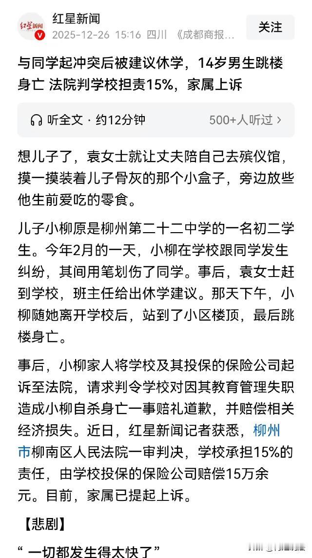 广西柳州,14岁男生患有抽动秽语综合征,上课时同学一直模仿他咳嗽的声音,男生忍无可忍和他打了起来,下课后用笔划伤了同学额头。班主任建议男生休学,家长接他回家后,男生爬到顶楼一跃而下。家长不能接受,起诉校方要求赔偿。 据红星新闻报道,14岁的小柳是一名初二学生,他经常控制不住情绪,家长带他去检查,确认他为抽动秽语综合征。 小柳正常的时候和其他孩子没有区别,但一旦心理压力过大或者受到刺激就会发病,发病时会出现紧张、情绪不稳定、自言自语、说脏话、抽动等情况。 因为有时候举止异于常人,老师曾4次找小柳的父亲蒲先生,建议小柳休学。 但是,小柳自己对上学很积极。蒲先生便将诊断说明和病历发给班主任,说明了小柳的情况。 班主任多次组织班干部谈话,将小柳的情况告诉了他们,让他们对小柳多加注意,如果小柳情绪有问题,让他们立即通知自己,也让他们平时多关心帮助小柳。 2025年2月19日下午,小柳所在班级正在上历史课。 上课期间,同学李某多次模仿小柳咳嗽,小柳受到刺激,走到李某旁边打了他一下。过了一会,李某再次模仿小柳,小柳又一次过去打了李某。 历史老师阻止了二人,可3分钟后,小柳再次朝李某丢了一个眼镜盒,两人开始对峙。 历史老师再次阻止,课堂秩序恢复,老师继续上课。 课间,李某走到小柳旁边,扶着他的肩膀在他耳边和他说话,半分钟后,小柳站起来和李某打在了一起,随后,小柳抓着一支笔划了李某额头一下。 李某捂着额头叫了起来,旁边的同学拉住了小柳,李某趁机锤了一下小柳的头,又向他肚子踹了一脚,旁边的同学赶紧拉住了他。 因为打架事件,班主任建议小柳休学。 小柳妈妈表示要回家商量一下,但答应先给儿子请一个星期的假,随后带小柳回家。 回家途中,妈妈很照顾小柳的情绪,多次停下来安抚他。 半路上,她给丈夫打了个电话,过了一会她发现儿子没跟过来。 小柳妈妈以为儿子从别的路回家了,赶紧告诉了丈夫,丈夫立马收工往家赶。 她一边往家跑一边打儿子的儿童手表电话,可一直打不通。10分钟后,小柳回拨过来,说在小区顶楼,他要自杀。 小柳妈妈吓得赶紧跑到楼上,小柳爬过围墙站在围栏外面。她吓哭了,一直求小柳不要做傻事。 小柳说,他在等着见老爸最后一面。 蒲先生赶到后,小柳面如死灰,说他没有书读了,以后怎么办。 蒲先生试图以自己的经历劝解安抚小柳,但小柳根本不听,他摘下电话手表扔在地上,义无反顾跳了下去。 小柳走后,父母在他的电话手表里听到了小柳留下的几段录音,其中一段中,小柳称老师说他极端。 对此,班主任称,他知道小柳的情况,不可能说他极端,连骂都没骂过他,他也没说让小柳休学,只是建议家长带他去检查检查。 案发后,小柳父母认为,小柳在上学期间遭到霸凌,而校方教育管理失职,因此要求校方赔礼道歉并赔偿。 经审理认为,根据《民法典》第一千二百条规定,限制民事行为能力人在学校或者其他教育机构学习、生活期间受到人身损害,学校或者其他教育机构未尽到教育、管理职责的,应当承担侵权责任。 小柳患有抽动秽语综合征,校方已知情并组织班干部关注其情绪,表明校方有一定管理意识。 在小柳与同学冲突过程中,虽然历史老师进行了阻止,但未能有效避免冲突升级,反映出校方在课堂秩序维护和学生冲突处理上存在不足。 校方多次建议小柳休学,结合其特殊情况,该建议会给小柳造成心理压力,影响其上学积极性和心理状态。 依据《未成年人保护法》,学校应保障未成年人受教育的权利,不得随意剥夺或变相剥夺。 学校的休学建议存在不当,与小柳自 杀这一损害后果存在一定因果关系。 但校方并非故意为之,仅存在管理上的瑕疵,并非造成损害后果的主要原因。 小柳已年满14周岁,属于限制民事行为能力人,根据《民法典》规定,其应当预见跳楼产生的严重后果。 小柳在冲突后选择极端方式结束生命,自身对损害后果的发生有一定责任,家长虽在回家途中安抚小柳,但仍未避免悲剧发生。 家长对患有特殊疾病的小柳,应给予更多心理关怀和引导,在一定程度上也存在监护和心理疏导不足的问题。 最终,一审认为,校方建议小柳休学存在不当,但在此事中,仅属于管理瑕疵,应承担此时15%责任,由学校投保公司代为赔偿小柳家属15.7万元。至于家属要求赔礼道歉的诉求,不予支持。 另外,小柳家属称小柳遭到霸凌,但案发当天是小柳先动的手,同班同学并未陈述小柳遭到霸凌,个人同学虽称有人嘲笑小柳,但嘲笑行为仅为不文明现象,构不成霸凌。 案发后,小柳妈妈说,小柳在的时候,就经常说想要个弟弟妹妹,但因为身体条件,她和丈夫觉得有小柳一个就够了,现在他们正在准备做试管。 现在,每当想儿子或者梦到他,她都会带上儿子喜欢吃的零食,去殡仪馆摸摸儿子的骨灰盒。 小柳妈妈说,等忙完手头的事,就带小柳回老家。
