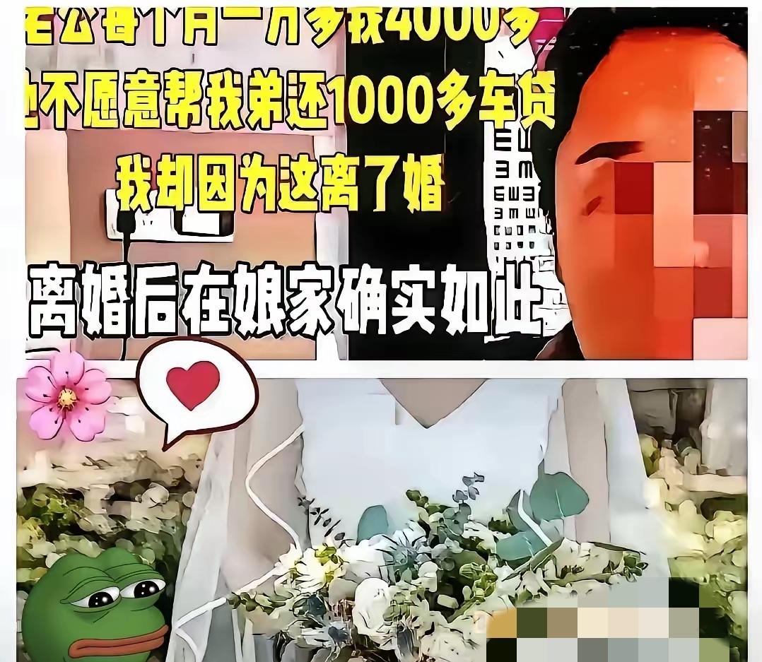 离大谱! 为逼老公每月掏1000多给弟弟还车贷,女子当场喊离婚,一天办完手续,结果回娘家直接被安排睡杂物间! 这哪是扶弟,简直是拎不清婚姻的轻重! 总有人觉得结婚后伴侣的钱就是自己的,可婚姻的本质是共建小家庭,不是给原生家庭当提款机。 老公的拒绝不是小气,是守住小家庭的底线——弟弟的车贷凭啥要别人的婚姻买单? 更讽刺的是娘家态度,前脚把女儿当补贴儿子的工具,后脚女儿没了利用价值就弃之不顾。 多少人栽在这种“没边界感”的亲情里,把伴侣的付出当理所当然,最后输了婚姻又丢了退路。 婚姻里最忌讳拎不清主次,原生家庭再亲,也不能凌驾于小家庭之上。 你身边有这种“扶弟魔”的离谱事儿吗?