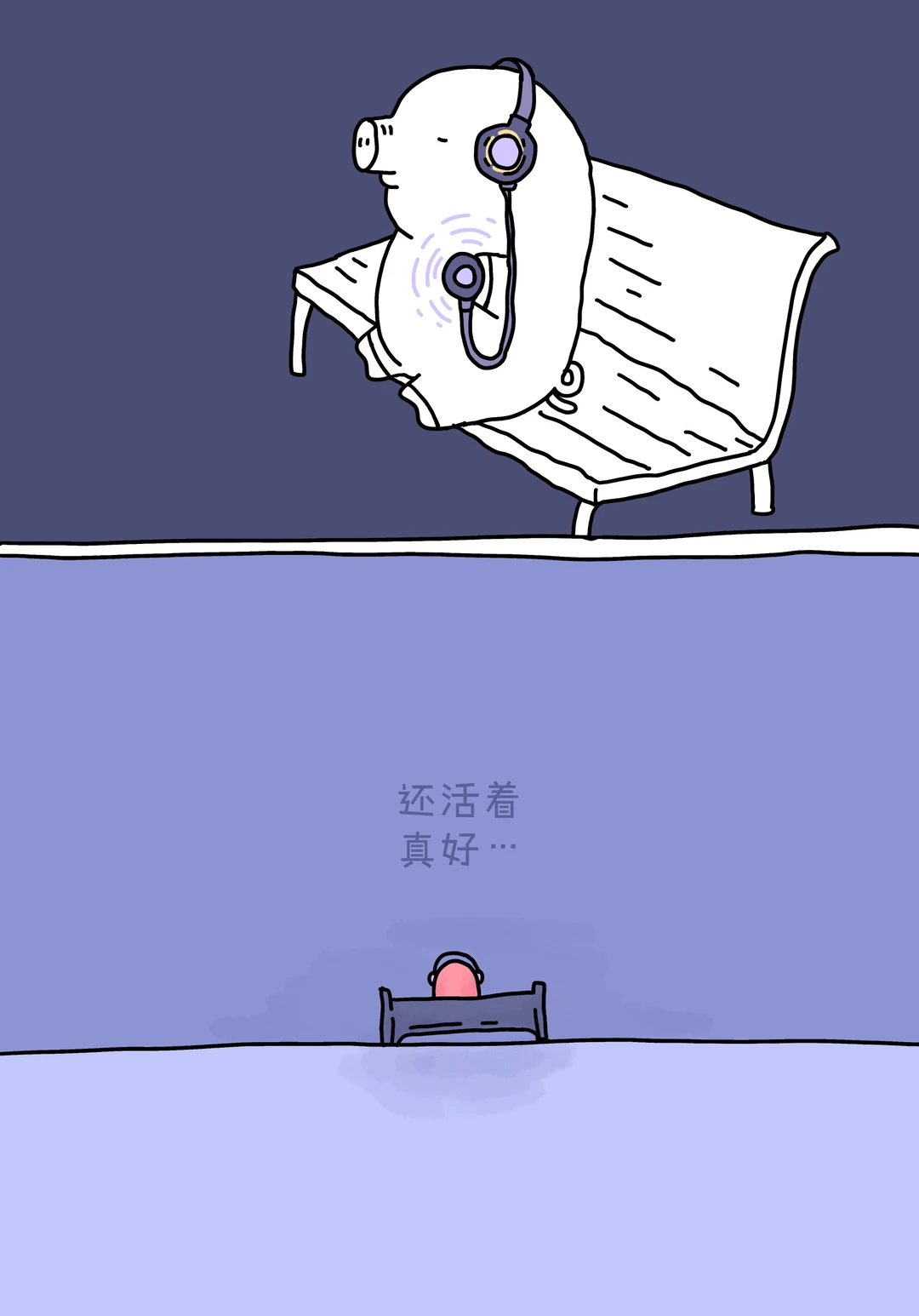 有一首歌,你没在倾听的时候,它也在播放。 猪猪 小猪 轻漫计划 可爱 治愈系漫画 治愈 治愈系 一只飞出猪栏的猪 插画 小漫画