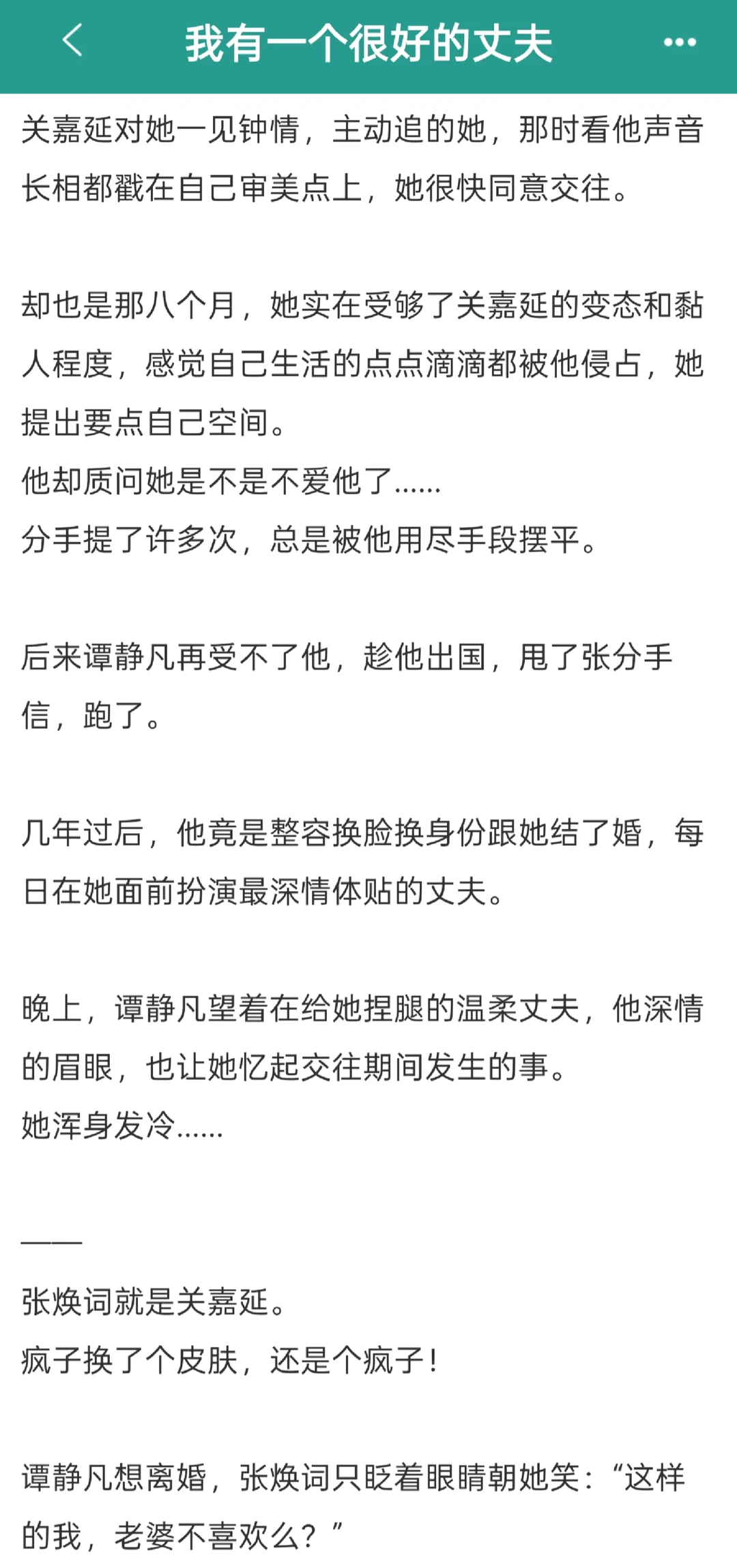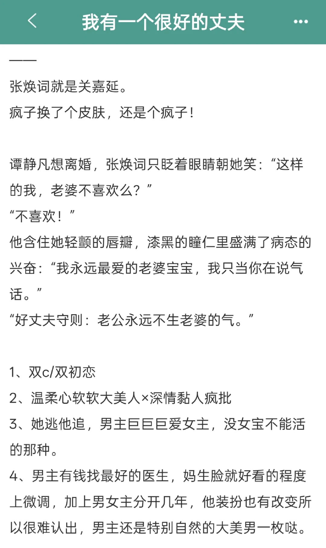 甜蜜日常!开篇就是婚后拉扯,女主的老公温柔顾家服务周到超会伺候的一款居家好男人! 所有人都觉得女主捡到宝了,直到女主发现那个秘密,男主真实身份其实是她那个她之前甩过的疯.批.病.娇前男友!后期强取豪夺她逃他追超带感!