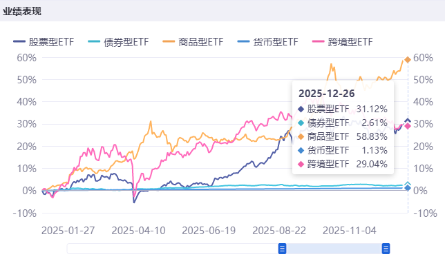 从年内各类型ETF业绩表现来看,根据同花顺iFinD,截至12月26日,商品型ETF平均单位净值增长率遥遥领先,达58.83%;此外股票型ETF和跨境型ETF的平均净值增长率也分别达到31.12%和29.04%。而债券型ETF和跨境型ETF的平均单位净值增长率分别只有2.61%和1.13%。