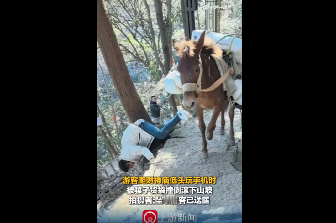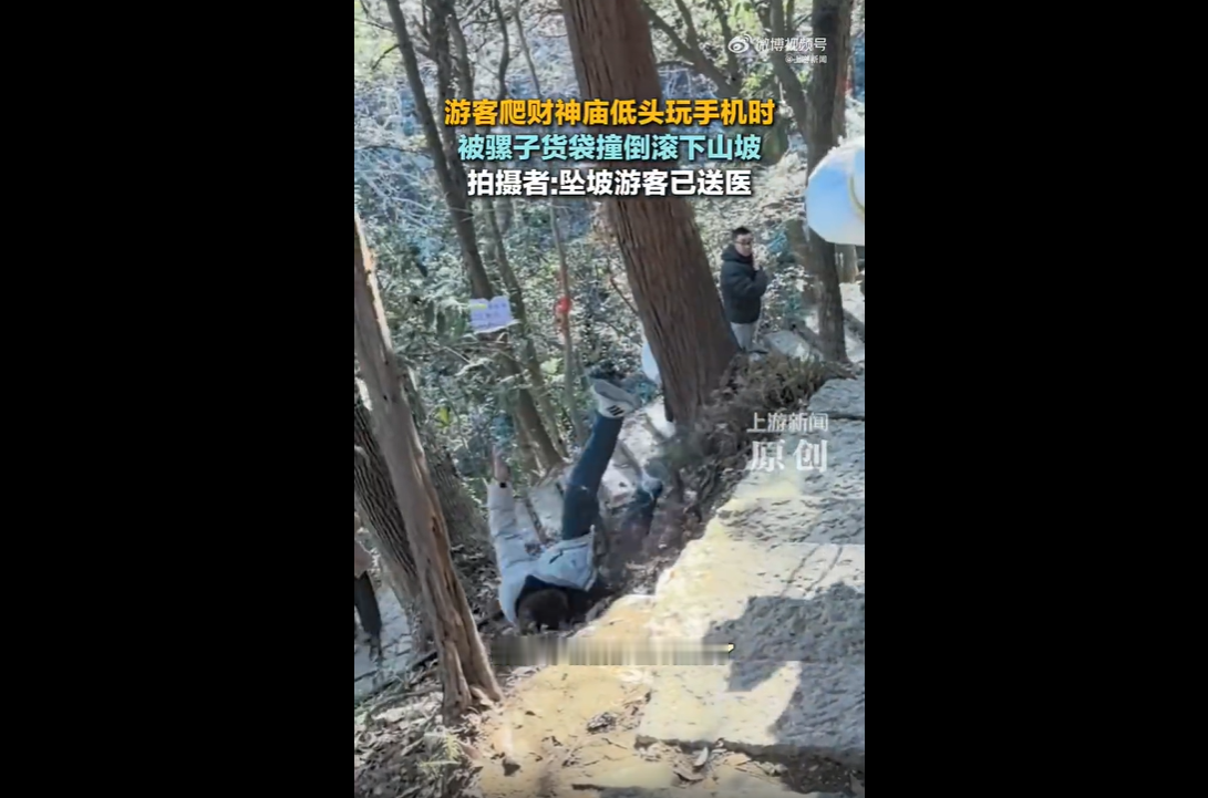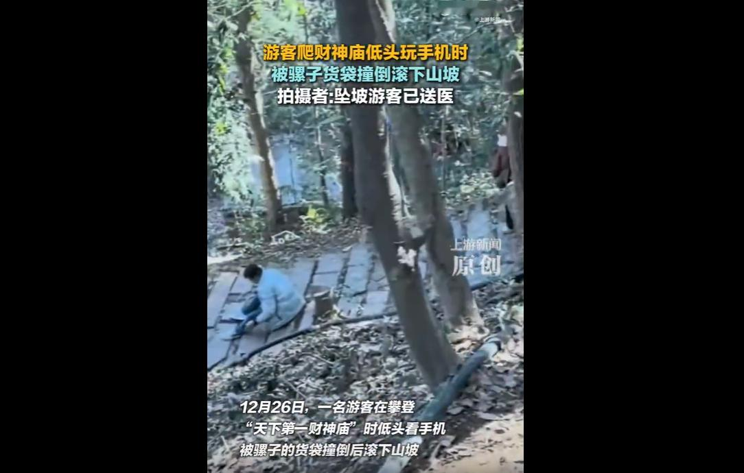 12月26日,浙江杭州一游客攀登“天下第一财神庙”时,因低头看手机被骡子货袋撞倒,滚下山坡。次日拍摄者证实,坠坡游客已被送医救治。 这游客简直自作自受。爬山放着脚下的路不看,一门心思扎进手机里,被骡子撞下山坡虽属意外,但是自己不好好走路,没摔出大问题都算万幸! 现在多少人是“手机奴隶”,走路看、吃饭看、爬山也看,眼里只有屏幕,完全没了安全意识,把自己的小命当儿戏,这种低级失误,说出去都让人笑话! 当然,财神庙登山道本就狭窄,还让骡子驮货通行,就没想过会和游客发生碰撞? 连个警示标识、疏导人员都没有,任由骡子和游客混行,这不是明摆着留安全隐患吗? 说白了,这事就是游客缺心眼、景区不作为!游客把安全抛在脑后,手机比命还重要;景区把管理当摆设,只想着赚钱,压根不管游客安危。 这事儿,游客当重视安全;景区也得赶紧整改,加设警示、疏导人流,别再让这种离谱的事故重演,不然迟早砸了自己的招牌!游客低头看手机被骡子货袋撞下山坡目击者回应游客被骡子货袋撞下山坡