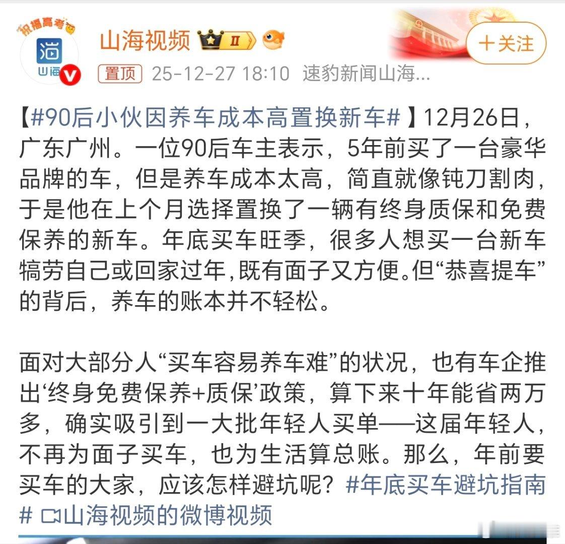 现在养车成本真不低,油费保险保养全是钱,保养老车不如直接置换一辆新车。虽说年底买车优惠大,但是也要注意避坑。比如你在提车时最好看下铭牌查出厂时间,然后落地价你要算清所有杂费,合同明确提车时间节点,警惕捆绑消费,省钱才是王道啊!90后小伙因养车成本高置换新车年底买车避坑指南