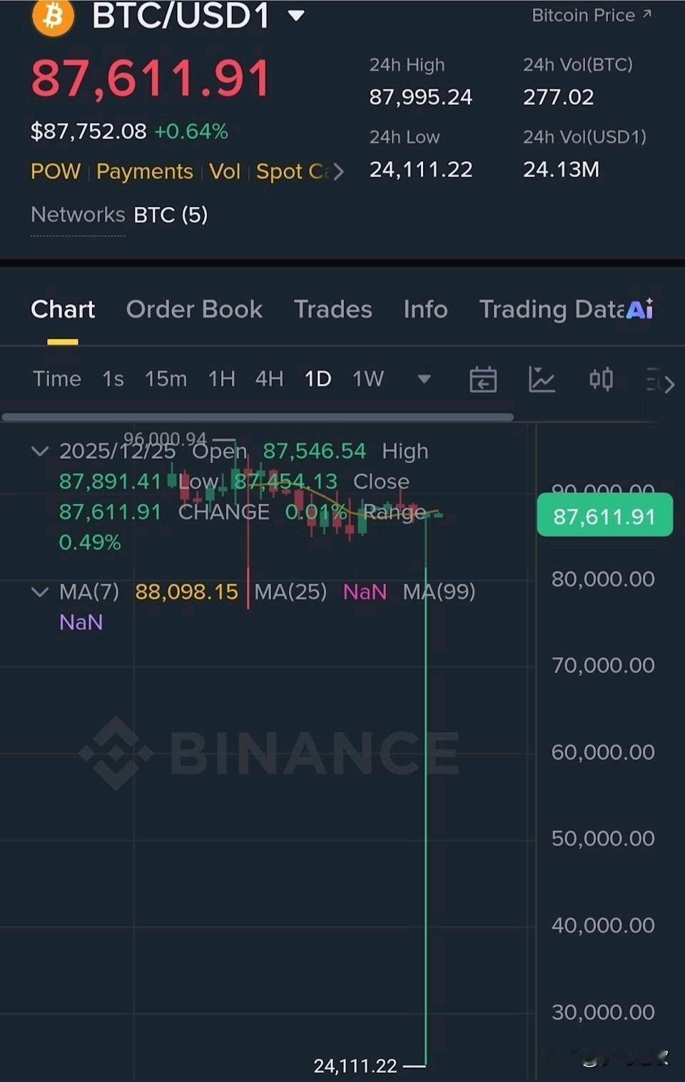 比特币大跌70%,各方给出了比特币暴跌理由 24日,币安交易平台上比特币突然闪崩70%,一度从87000美元,跌到了24111美元,随后几秒后恢复。 如果在这几秒内买到了一枚比特币,就赚了64000美元,可谓真的在捡钱。 市场有人猜测:比特币存在内幕交易,不过随后被否定,因为只有币安交易平台闪崩。 随后有大佬出来猜测:可能是流动性不足造成的价格失真。就是在圣诞节期间交易者都去过节,导致市场交易寡淡,这时候有一笔大的卖盘出现,就会把比特币的价格打下来。 币安创始人也出来澄清,此次比特币的暴跌并不没有出现爆仓,也不存在漏洞。