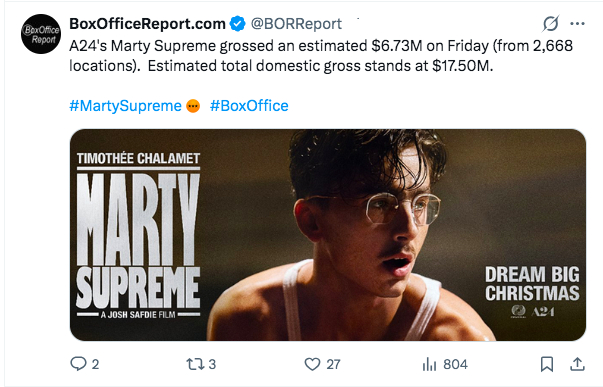 TNABO 《至尊马蒂》北美周末四日冲击2700万美元,靠接下来的颁奖季战线预计不仅要改写三年前《瞬息全宇宙》缔造的A24本土发行史票房纪录(7719万美元),也将是这家发行商最接近本土单片票房破亿的一次机会。CinemaScore调查显示,这部R级剧情传记片取得了B+的观众评价,高于《原钻》的C+和《粉碎机》的B-。另一家机构PostTrak表示,首日购票人群中占比最高的是25+男性(36%)和25+女性(27%),25岁以下男女分别是21%和16%;族裔分布顺序是白人(51%)、拉丁西语裔(23%)、亚裔(11%)和非裔(10%);有50%受访者表示,自己是冲着主演提莫西·查拉梅前来观看本片的。