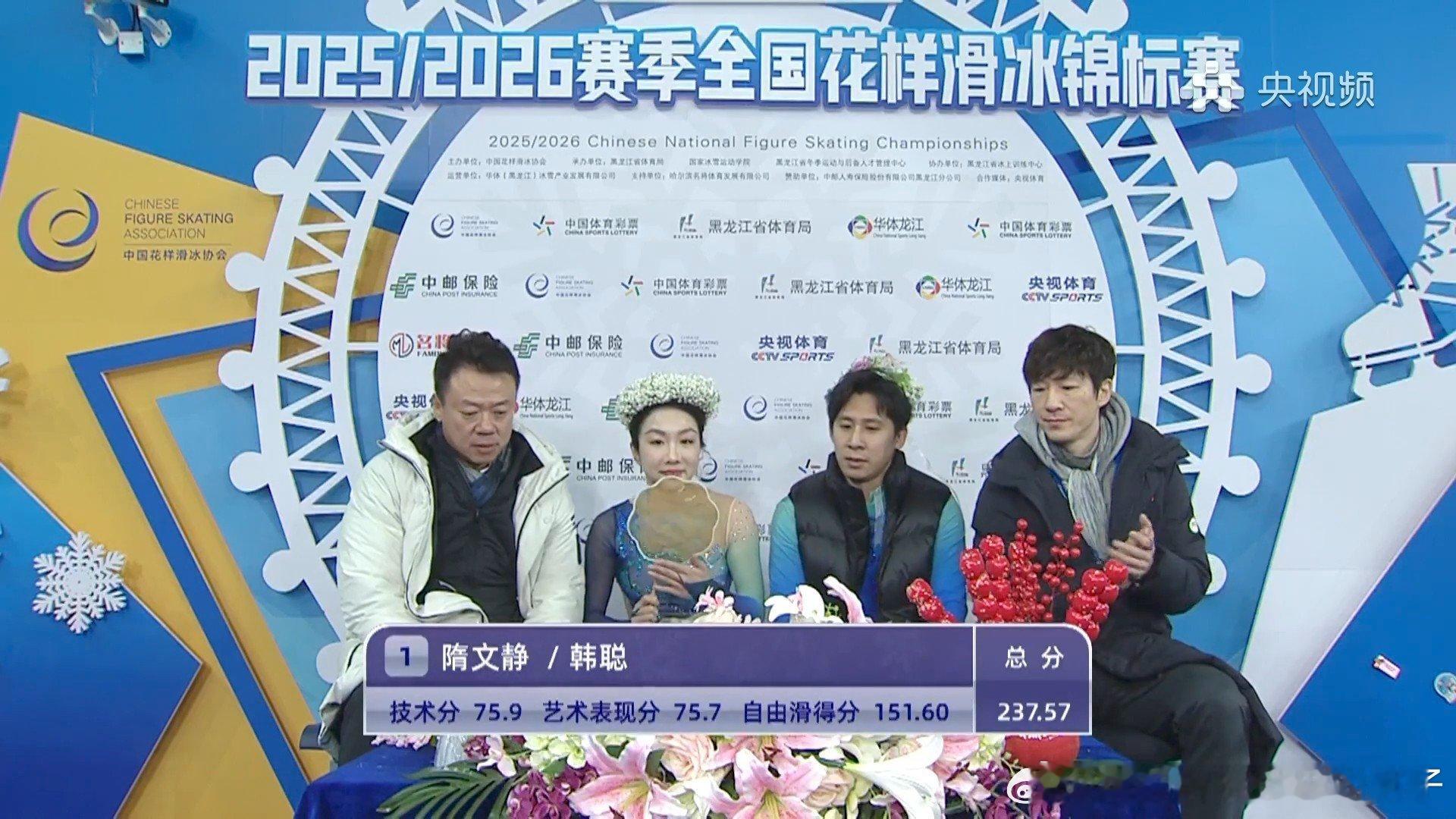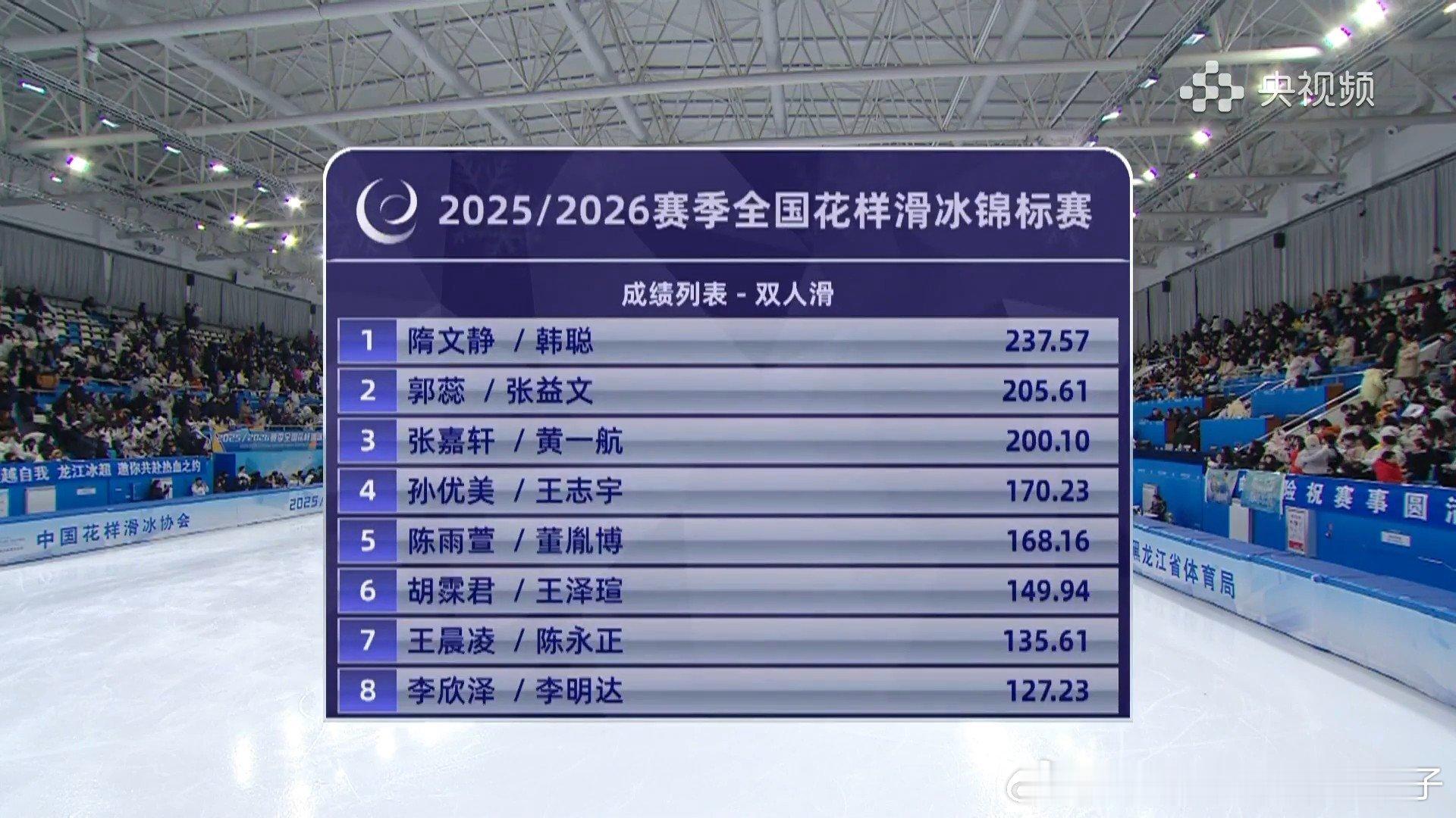 2025/2026赛季全国花样滑冰锦标赛双人滑:隋文静韩聪总分237.57分获得冠军🏆葱桶米兰见了郭蕊张益文总分205.61分获得亚军🥈张嘉轩黄一航总分200.10分获得季军🥉