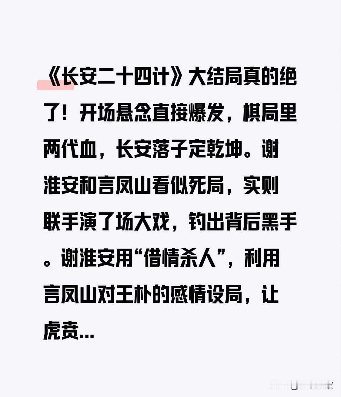 《长安二十四计》大结局真的绝了!开场悬念直接爆发,棋局里两代血,长安落子定乾坤。谢淮安和言凤山看似死局,实则联手演了场大戏,钓出背后黑手。谢淮安用“借情杀人”,利用言凤山对王朴的感情设局,让虎贲大乱。 但这只是计中计,他们真正的敌人是铁秣人,谢淮安救下言凤山,两人暂时放下恩怨联手。 结尾是开放式互动,粮仓巨响炸碎25年的局,谢淮安等人都是更高层棋盘的卒子。剧情还结合了《旧唐书》和唐代边疆史,细节拉满,让人追剧时还能被历史“补课”,太值得回味了。 长安二十四计 长安24计 长安二十四记 长安二十计 长安二十四戏 长安24计 长安二十四记 长安二十计 长安计 长安十二计 长安二十四戏 长安二十四杀