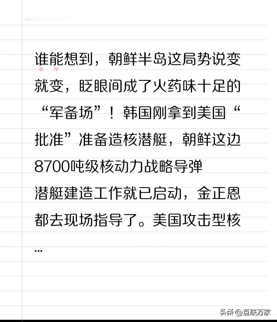 谁能想到,朝鲜半岛这局势说变就变,眨眼间成了火药味十足的“军备场”!韩国刚拿到美国“批准”准备造核潜艇,朝鲜这边8700吨级核动力战略导弹潜艇建造工作就已启动,金正恩都去现场指导了。美国攻击型核潜艇驶入韩国釜山港,核动力航母战斗群现身,朝鲜也不甘示弱,宣布战略核潜艇即将下水,还成功试射远程防空导弹。 双方这种你来我往的军备竞赛,就像一场没有硝烟但异常激烈的战争。过去几年,美军战略资产一来,朝鲜48小时内准试射导弹。这安全信任一旦崩塌,就像打开了潘多拉魔盒,局势愈发紧张。 这朝鲜半岛的“军备场”后续会怎样发展?东北亚局势又会受到多大影响?美俄在这场博弈中还会有啥新动作?真让人忍不住持续关注。 朝鲜半岛 朝鲜冲突 朝鲜半岛冷战 韩国朝鲜矛盾 江对岸的朝鲜 韩国朝鲜半岛 美军在朝鲜半岛