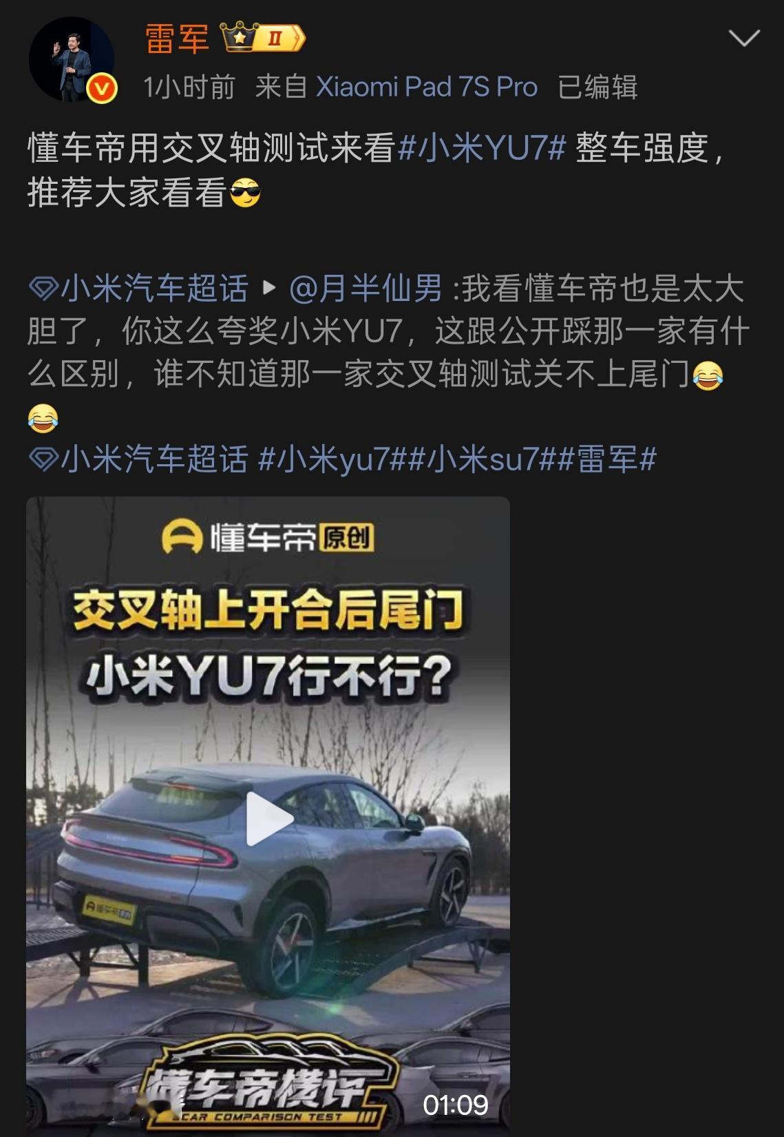 雷军:推荐大家看看交叉轴测试,小米YU7整车强度表现。