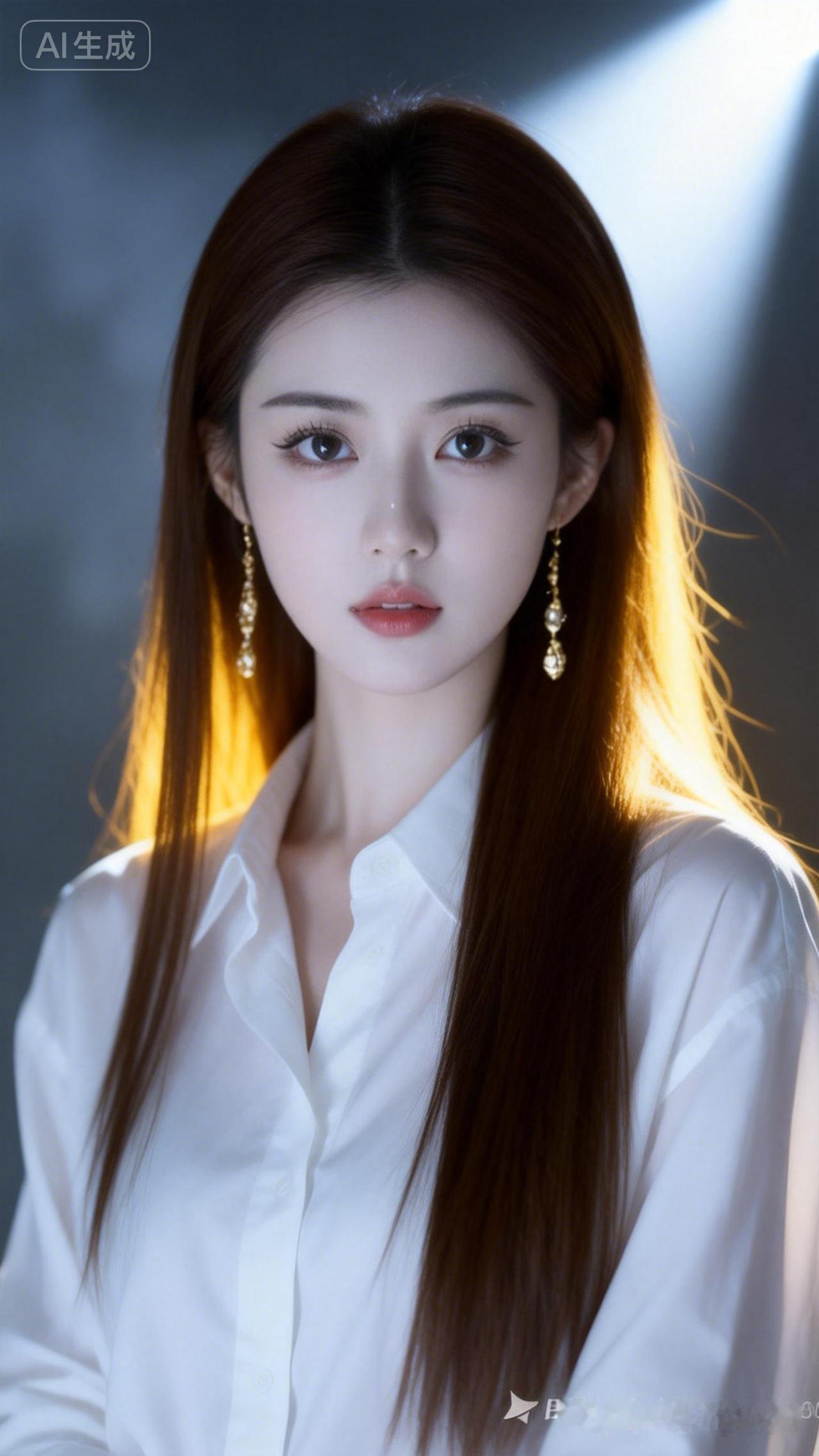 漂亮女生自然棕色直发在白色聚光灯下飘逸,冷白皮与淡妆更显清透。白色衬衣搭配酷酷气