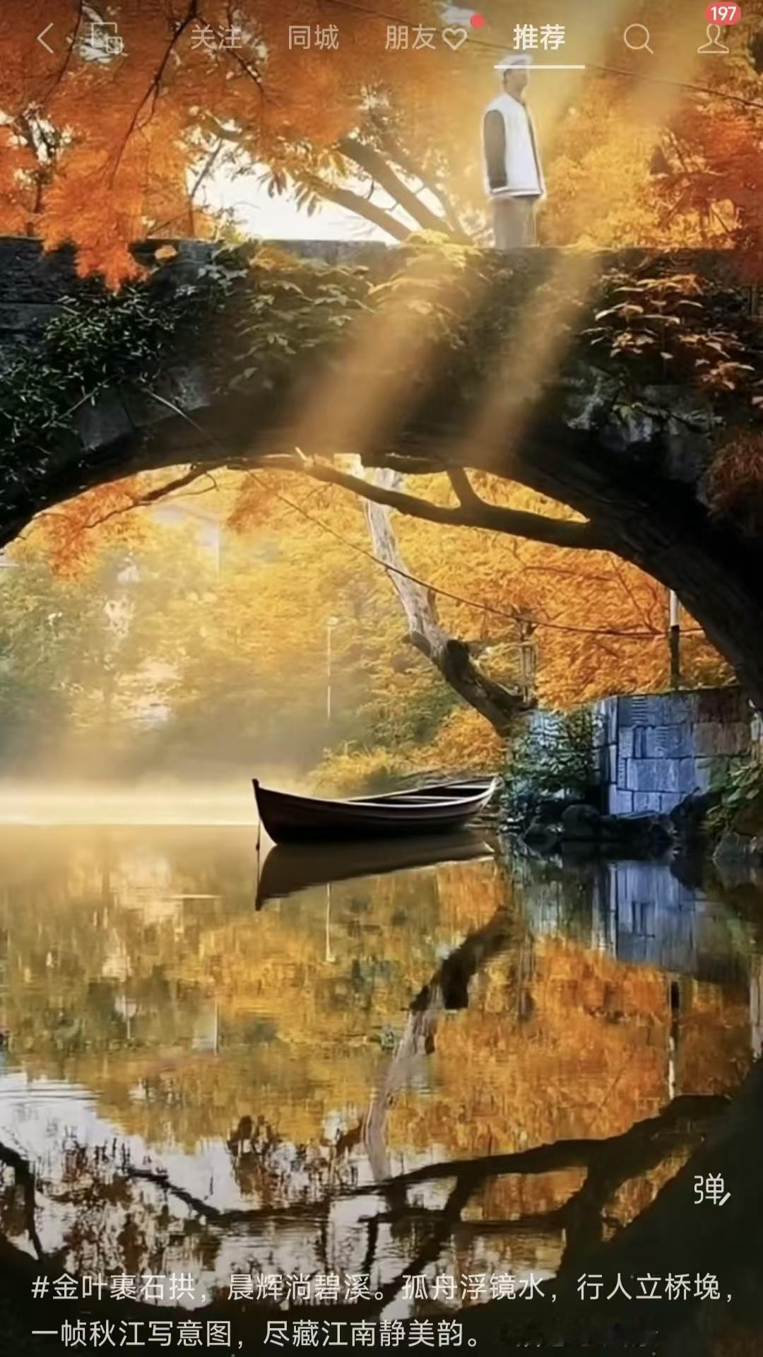 天净沙·秋江静美 金叶环绕桥拱, 晨辉轻淌溪中。 孤舟浮于镜梦。 行人桥踵, 江南秋韵情浓。