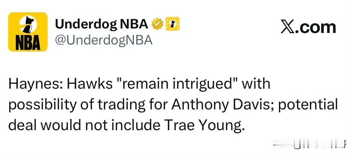 状元换状元!!!老鹰对安东尼-戴维斯非常感兴趣! 根据记者Chris Haynes最新消息透露,东部的亚特兰大老鹰队非常有意安东尼-戴维斯,他们愿意通过交易得到浓眉。 浓眉前往东部的可能性还是比较大的,西部的竞争压力较大,而且内线都比较强,浓眉现在的小身板已经打不了高强度比赛了,出战30分钟以内就是比较理想的。 老鹰那边啥都有,他们的资产满足独行侠的要求,独行侠希望能够在浓眉的交易中得到里萨谢、选秀权、到期合同和年轻资产 ,国外球迷也立刻就给他们模拟了一下交易,看着是不是没什么问题。 波神又回到达拉斯了,不过也是到期合同,问题不大,两个选秀权预计不会太高,不过有两个也不错了。 大家觉得这样的交易如何呢? 独行侠 浓眉 戴维斯 安东尼戴维斯