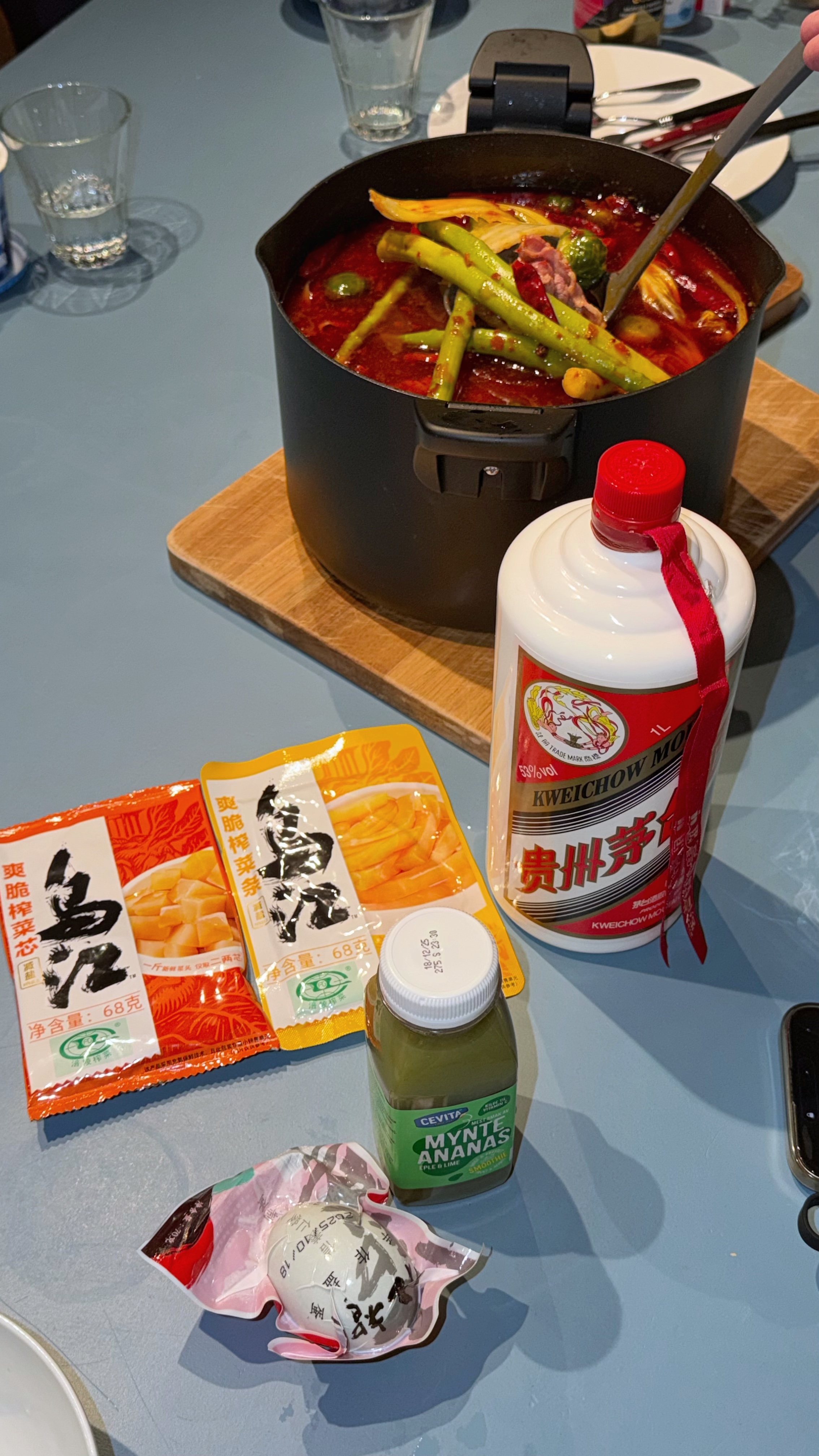 没想到来挪威🇳🇴的第一个夜晚,他们就想吃家乡口味了,虽然我还是想继续尝试白人饭,但我还是煮了一锅四川火锅给大伙下酱香型白酒,我们5个人喝1L差不多了,这边凌晨00:13分了,我也准备睡了,明天早起继续自由🏃挪威旅行挪威旅游 挪威·tromso