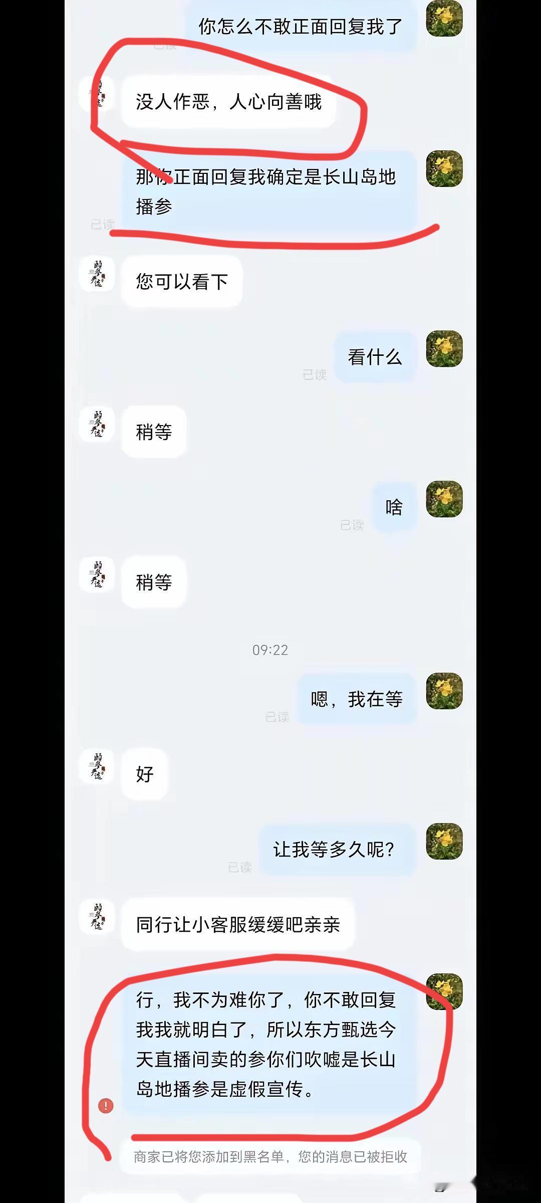 某直播间卖海参又涉嫌虚假宣传。 明明是人工养殖海参, 还是个头不大那种。 个头小, 价格不低, 因为他们打着天然野生的旗号, 直播间里的宣传是: “因为生长在大连北纬39°的冷水海, 海底自然成长, 无投喂,不催熟, 所以长得慢, 个头小。” 呵呵呵, 很多路人还真的就信了, 野生的的确是长的慢, 于是乎框框下单。 有较真的消费者去问直播间的客服, 这海参是大连哪片海底捞的? 客服打太极半天, 并且还教育消费者要人心向善。[大笑][大笑] 在消费者紧追猛打的情况下, 不得不承认这是围海养殖的, 回答完了就把消费者拉黑。 这是啥操作? 但凡质疑他们的, 都直接拉黑, 这又完美的净化了消费者啊, 只留听话的。 对于虚假宣传这条路, 他们走的是轻车熟路啊, 一次两次三四次, 没被发现就是直播间和商家皆大欢喜, 发现了就直播间就把消费者直接拉黑。 这就是所谓的文化直播间? 玩的是“高大上”, 咱们底层人看不清。 与辉同行也卖海参, 价格我没做比对, 不知道哪家的更有性价比。 但是我只知道, 他们在直播间介绍产品的时候, 说的是清清楚楚, 他们卖的就是围海养殖的。 不管价格如何, 与辉同行的产品信息和价格都是公开透明的, 明码实价童叟无欺, 消费者按需消费。 不炒作不虚假, 所以与辉同行的回头客才这么多。 假的就是假的, 一次两次三四次, 寒的是顾客的心。 散会! 董宇辉