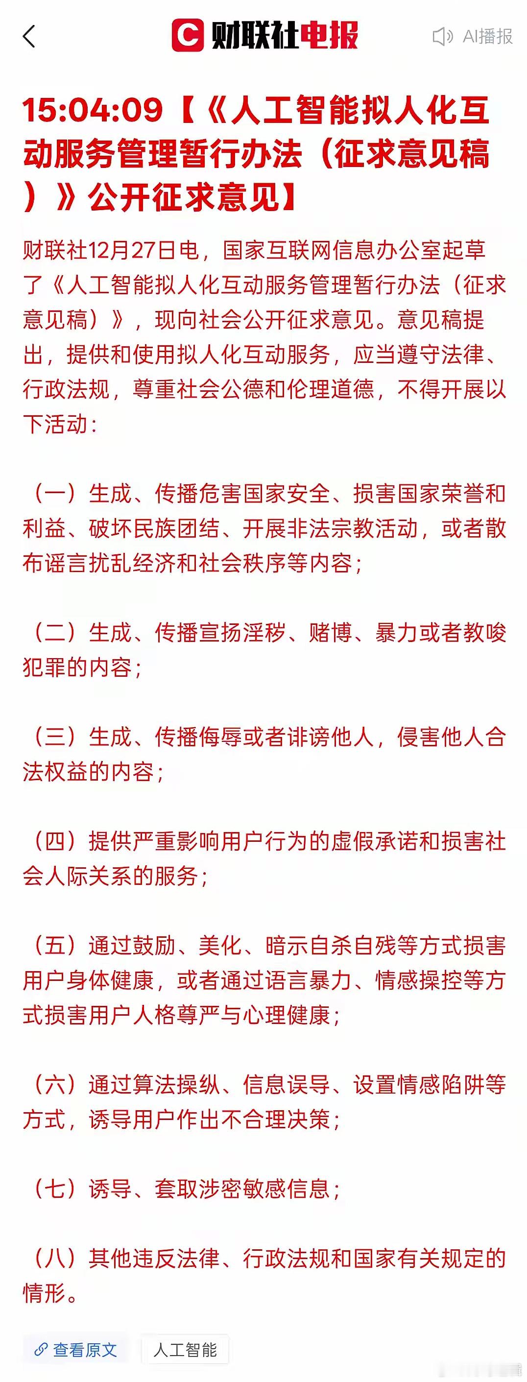 下周,人工智能板块开涨了,人工智能拟人化互动服务管理暂行办法(征求意见稿)未来,人工智能发展的更加先进,技术要求方面也更加越来越严苛,对于人工智能生成给出了相关未来法律界定的要求!随着AI人工智能更加的变得拥有智能化,所以,对人工智能的规范,未来法律的界定将变得至关重要