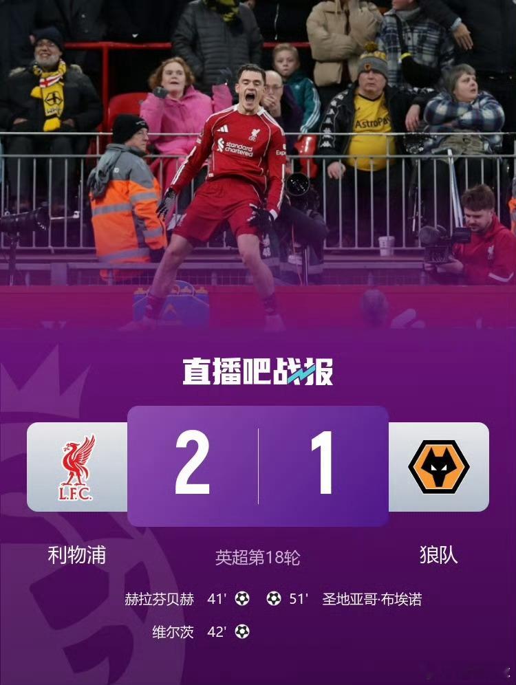 利物浦2比1狼队维尔茨利物浦首球 英超第18轮,利物浦2-1战胜狼队暂升第4,联赛3连胜+近6轮不败;维尔茨打进利物浦生涯处子球,赫拉芬贝赫破门;狼队联赛11连败。