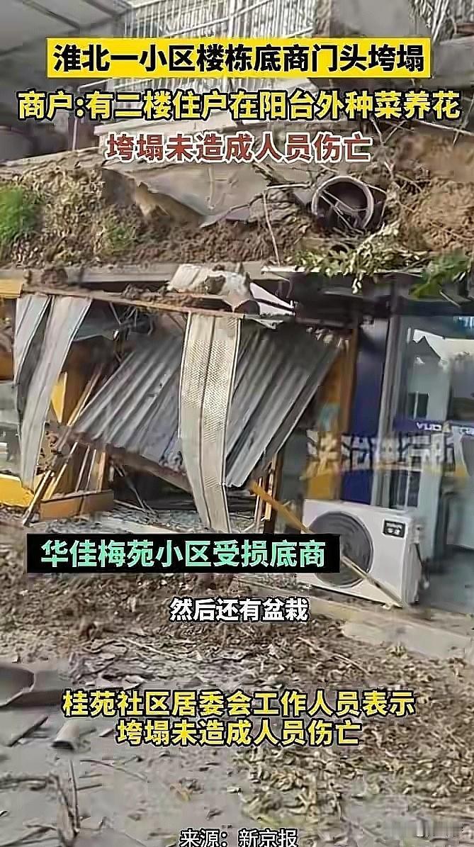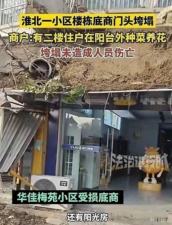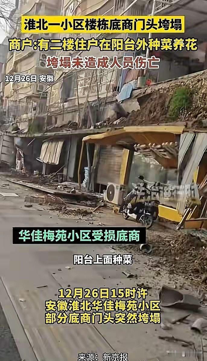 楼上种菜,楼下遭殃!安徽淮北一小区,十几家商铺门头被砸塌,只因楼上大爷在阳台堆了半米土种菜! 12月26日下午3点多,淮北华佳梅苑小区,突然传来一声巨响,一排底商的门头齐刷刷塌了,十几家店铺的招牌和墙体瞬间损毁,现场一片狼藉。万幸的是,当时没有人员经过,不然后果不堪设想。 罪魁祸首是谁?二楼一位退休业主的“空中菜园”。为了过把瘾,大爷在阳台堆了半米厚的土,比膝盖还高,平时浇水跟发大水似的,又没做排水,时间一长,阳台底板彻底“罢工”,连带着女儿墙一起砸向了楼下。 最让商户寒心的是,这隐患早就有了。他们之前就苦口婆心劝过,也找物业投诉过,可人家根本不听,觉得“种点菜能有多重”,依旧我行我素。 目前街道办已经定性:种菜业主负主要责任,物业监管不力负连带责任。 这事儿也给爱种菜的友友提了个醒:楼房阳台不是农田,承重真的有限,千万别拿安全开玩笑! 安徽 生活