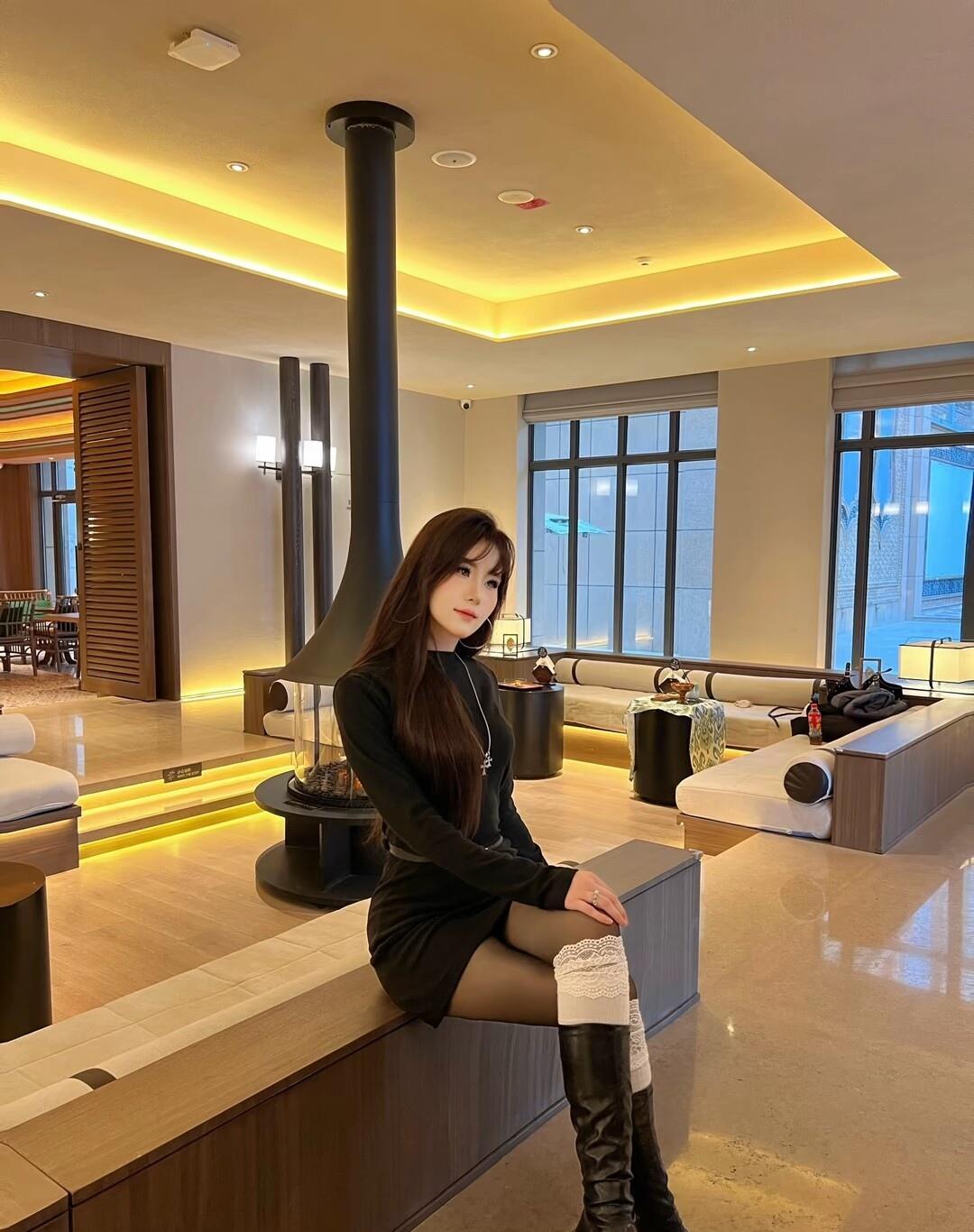 咖啡馆里的优雅时光,黑丝与米色毛衣的完美搭配